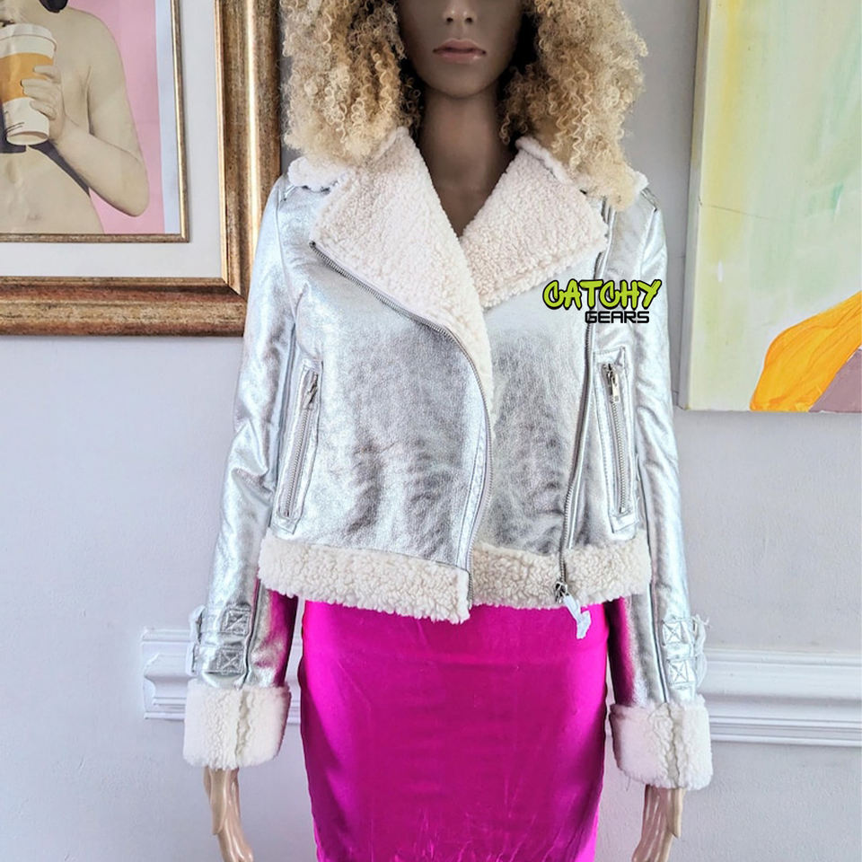 แจ็กเก็ตหนังแท้โอเวอร์ไซส์สำหรับผู้หญิงแจ็คเก็ตขี่มอเตอร์ไซค์หนังลายจระเข้ระยิบระยับใหม่