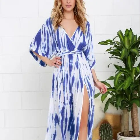 ชุดเดรสยาวถึงพื้นแบบผูกย้อมสีอินเดียใหม่ชุดเดรสยาวครึ่งแขนพร้อมพู่ผูกเอวเป็นของขวัญสำหรับผู้หญิง