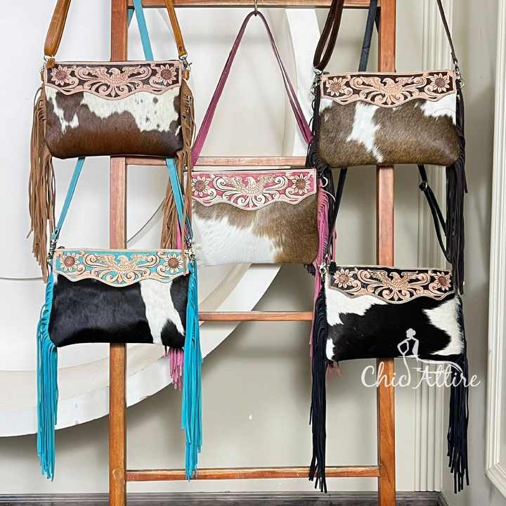 กระเป๋าสะพายข้างหนังวัวแท้ ทำมือ ประดับพู่