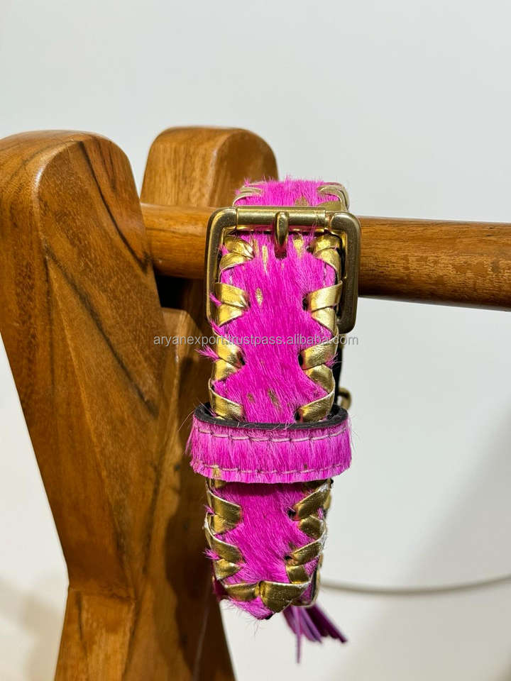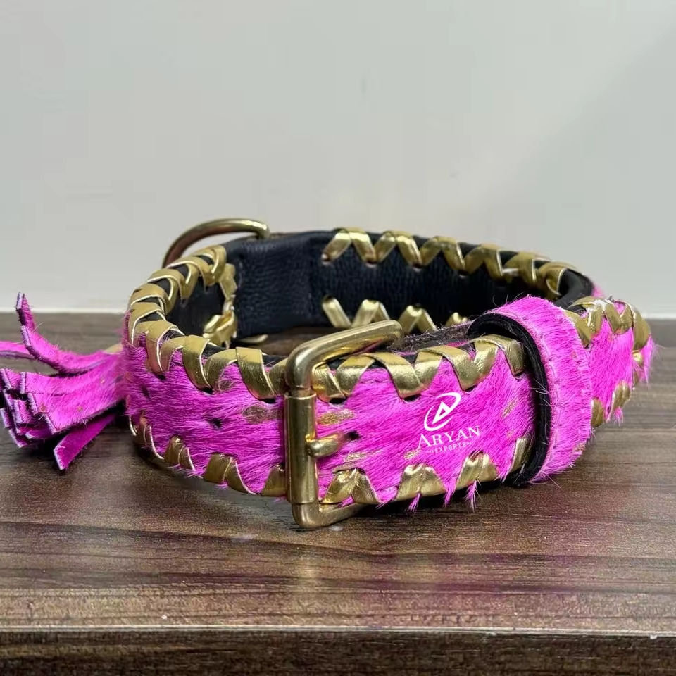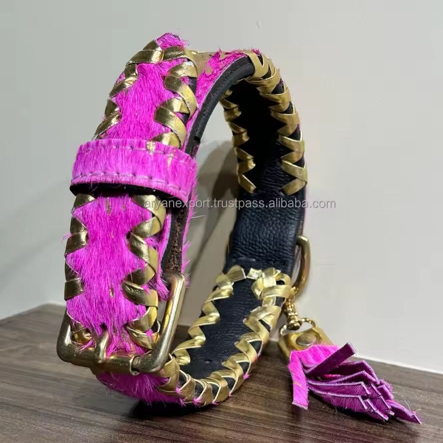 ขนแกะแท้สไตล์ตะวันตกบนสายจูงสุนัขหนังวัวสีเมทัลลิก