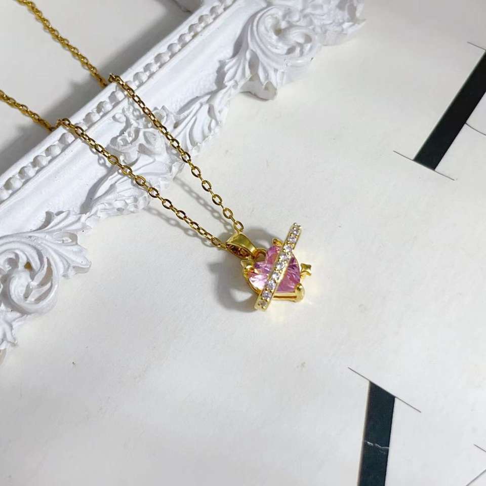 สร้อยคอจี้หัวใจเพทายสีชมพูแบบใหม่สร้อยคอสร้อยคอโซ่เหล็กไทเทเนียมอัญมณีรูปหัวใจสำหรับผู้หญิง