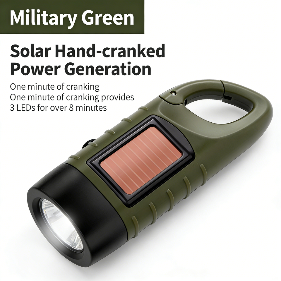 ไฟฉาย LED พลังงานแสงอาทิตย์แบบพกพาขนาดเล็ก พร้อมห่วงสำหรับปีนเขา และระบบหมุนมือ ไฟฉายยุทธวิธี