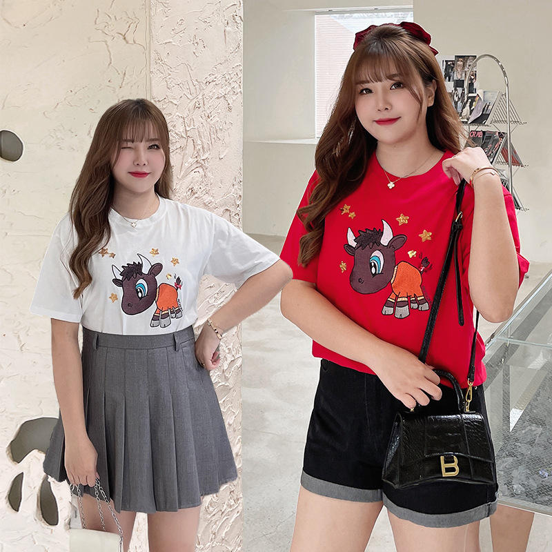 เสื้อยืดแขนสั้นพิมพ์ลายการ์ตูน Lucky Calf สำหรับผู้หญิงไซส์พลัส รุ่น N7979 สีขาว ดำ แดง ผ้าคอตตอนเจอร์ซีย์ สำหรับผู้ใหญ่