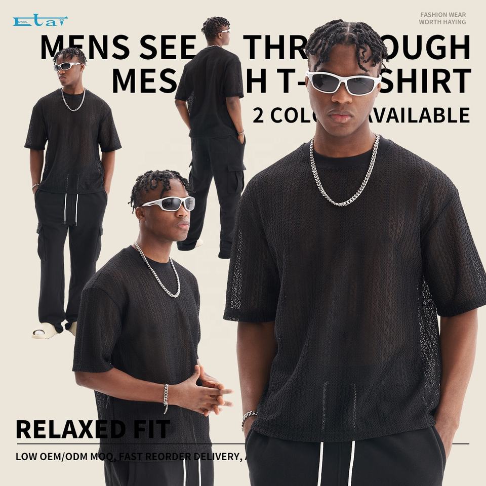 เสื้อยืดตาข่ายโชว์ไหล่สำหรับผู้ชายเสื้อยืดคอลูกเรือเข้ารูปแบบผ่อนคลาย