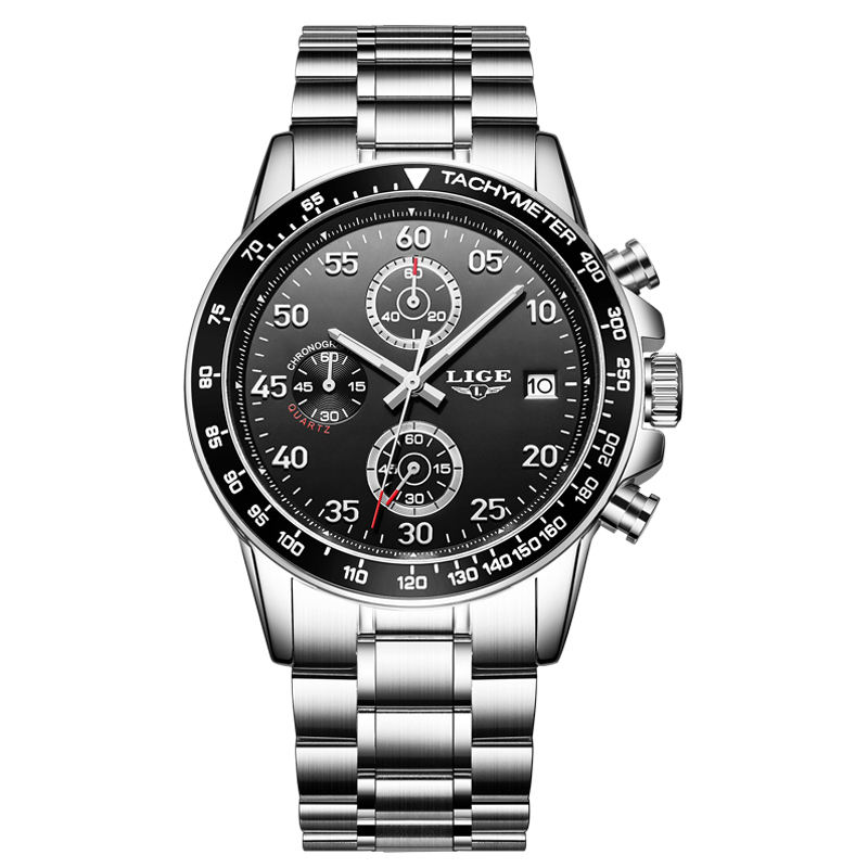 นาฬิกาข้อมือควอตซ์ผู้ชายสายเหล็กสามเข็ม รุ่นใหม่ยอดนิยม พร้อมปฏิทิน กันน้ำ 30 เมตร ดีไซน์ธุรกิจลำลอง คุณภาพสูง พร้อมฟังก์ชั่นโครโนกราฟ