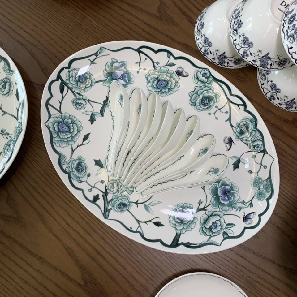 ชุดรับประทานอาหารค่ำ41ชิ้นสำหรับครอบครัวจานจีนลายพอร์ซเลนสีเขียวหรูหราสไตล์ยุโรป