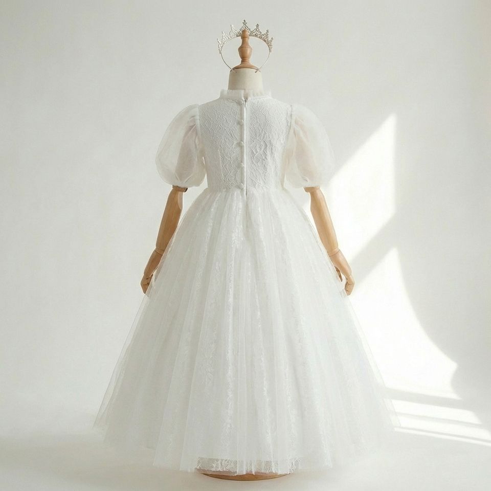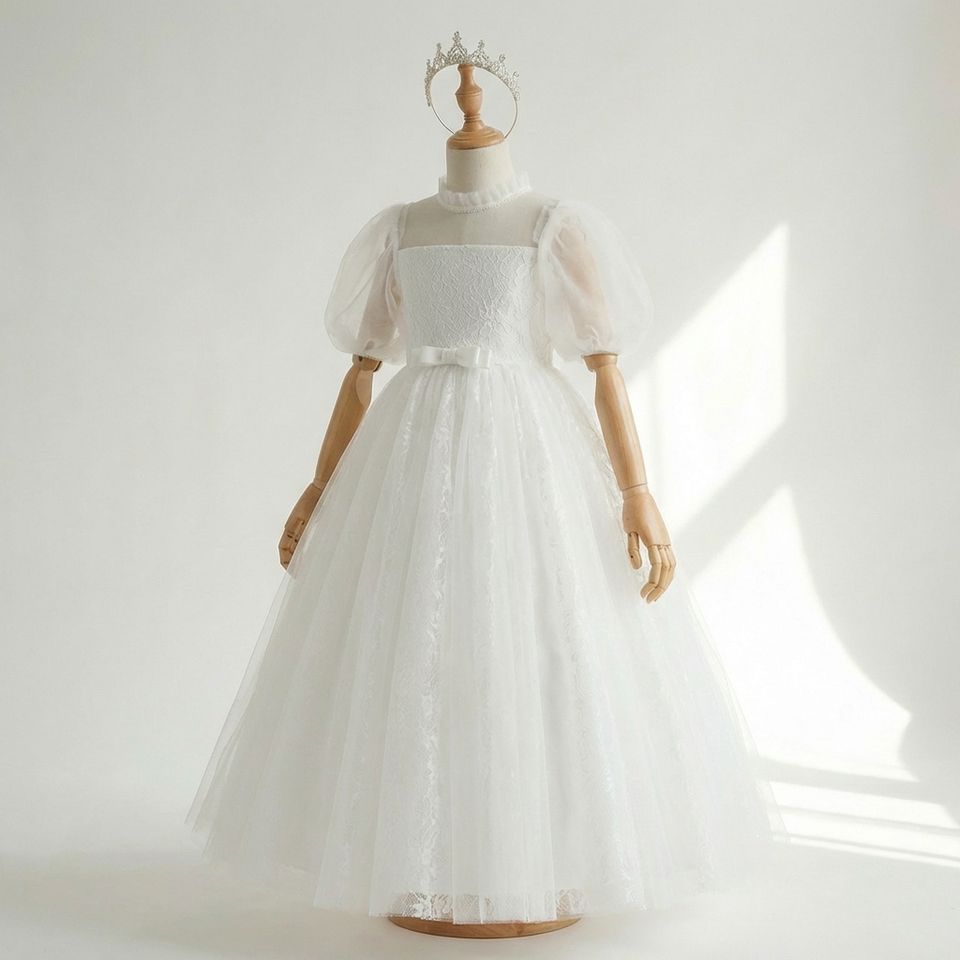 ชุดเดรสสีขาวแขนสั้นสำหรับเด็กผู้หญิงตัวเล็ก คอเสื้อแบบ Illusion แต่งลูกไม้สีขาว ชุดเดรสบูติกผ้าทูลล์ทรงบอลกาวน์ สำหรับงานแต่งงาน