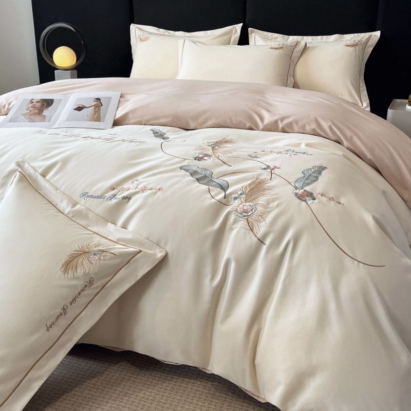 ชุดเครื่องนอนผ้าฝ้ายแท้เส้นใยยาวพิเศษ ความหนาแน่นสูง ระดับพรีเมียม ปักลายสองชิ้น ชุดสี่ชิ้น สไตล์เรียบง่าย สำหรับฤดูใบไม้ร่วง