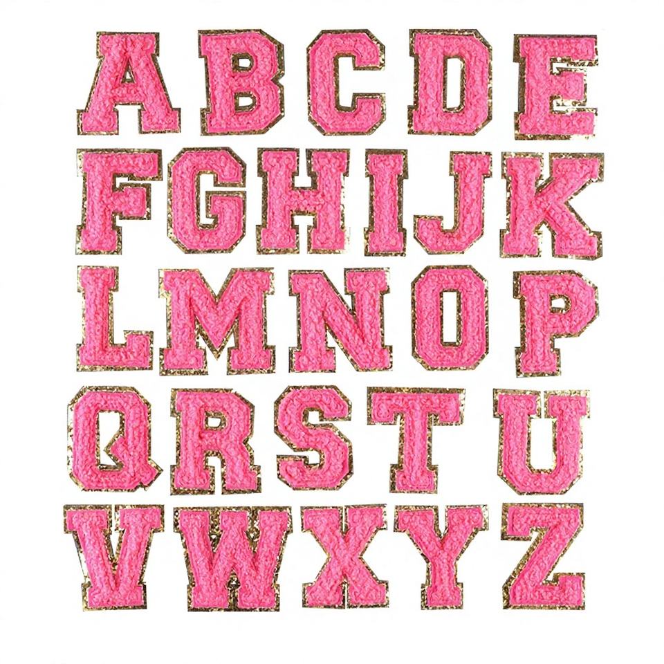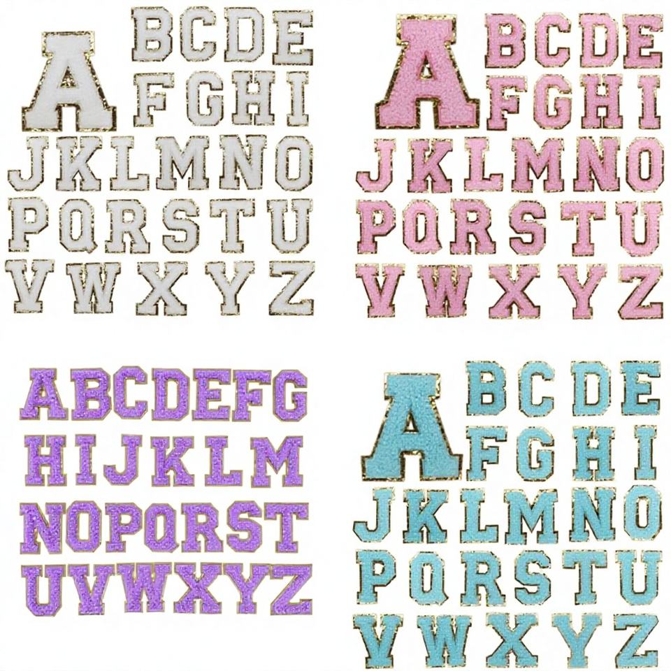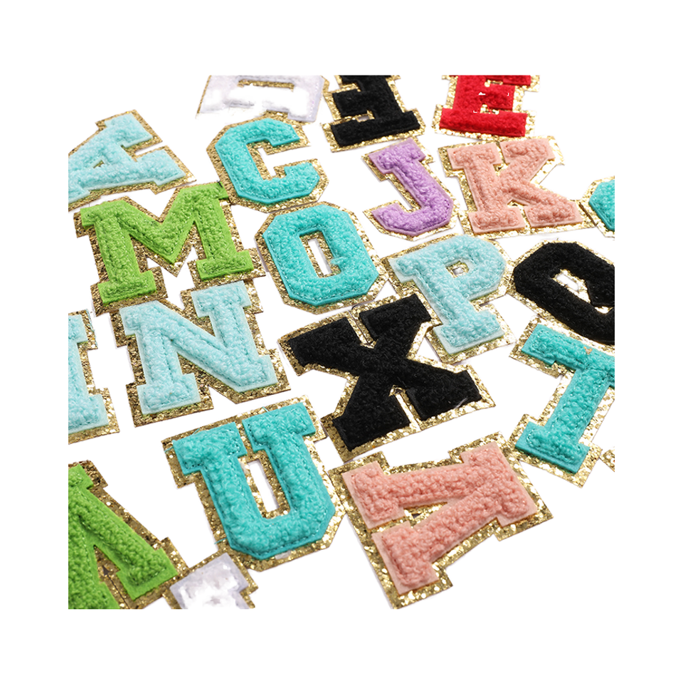 ป้ายติดเสื้อปักลายตัวอักษรภาษาอังกฤษสีม่วงเงินขอบกลิตเตอร์วิบวับ ขนาด 6.5 ซม. แบบรีดติด วัสดุเชนิลล์ เป็นมิตรกับสิ่งแวดล้อม แบบ 3 มิติ