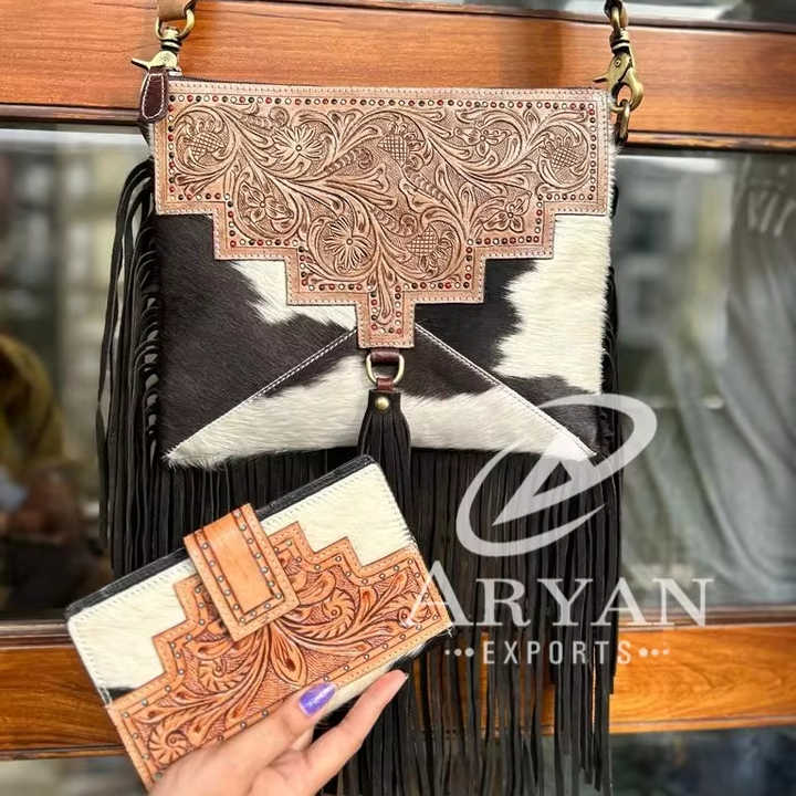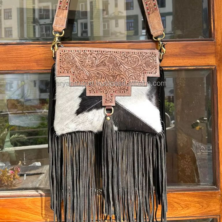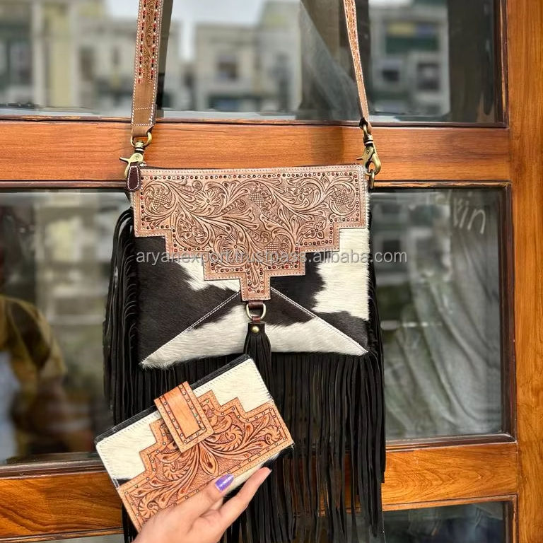 กระเป๋าถือหนังวัวขนเฟอร์เครื่องมือทำมือสไตล์ตะวันตกใหม่สำหรับผู้หญิงกระเป๋าตอนเย็นมีสไตล์และคลัทช์ขนสัตว์ที่ไม่ซ้ำกันชุดคอมโบ