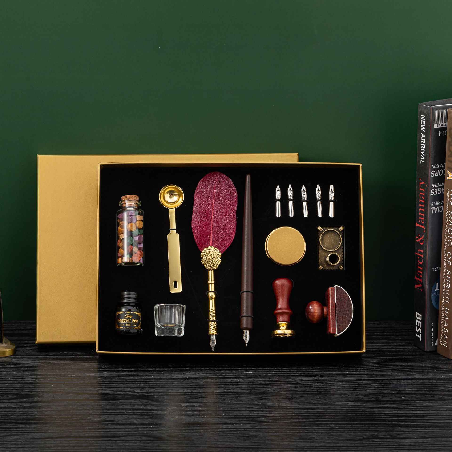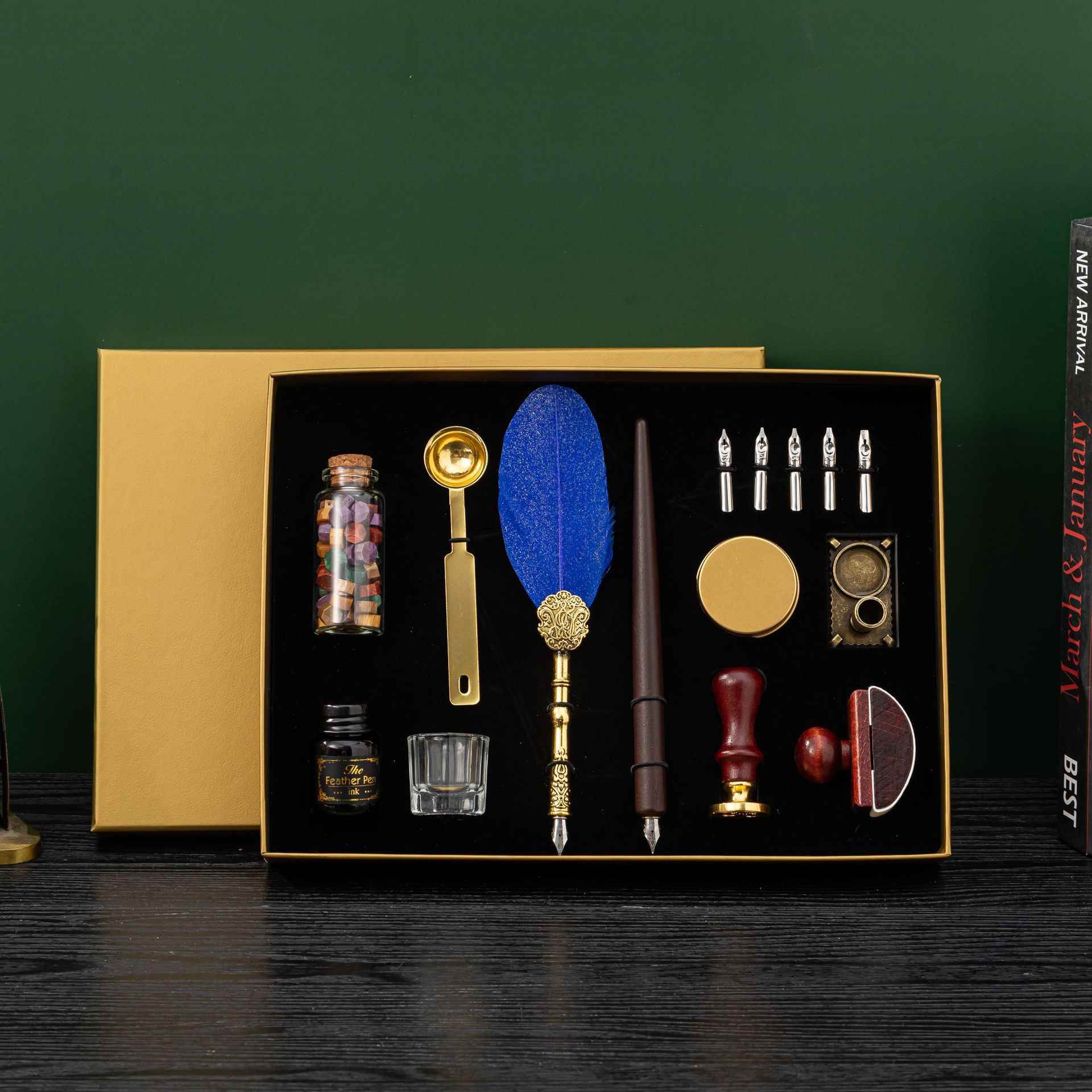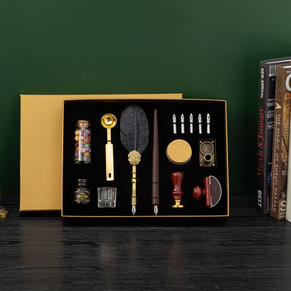 New Retro Calligraphy Quill Feather Dip Pen with Nibs Wax Seal Stamp Holder Gift Box