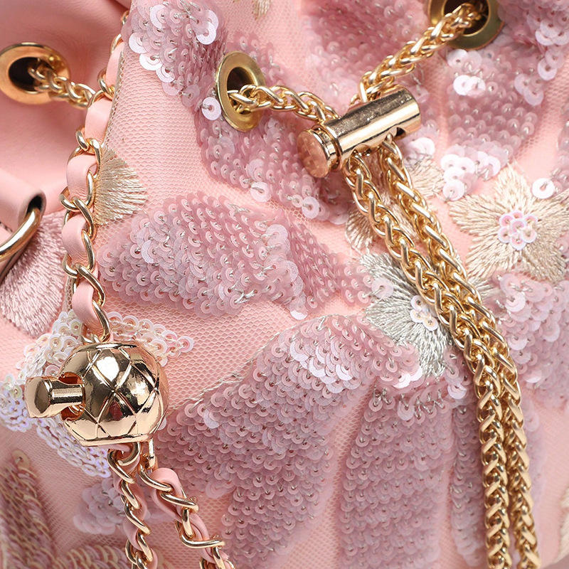 กระเป๋าทรงถังสไตล์เรโทรใหม่สำหรับผู้หญิง พร้อมงานฝีมือคุณภาพสูง ตกแต่งด้วยลายปักดอกไม้แบบตาข่าย ประดับเลื่อม และสายสะพายโซ่