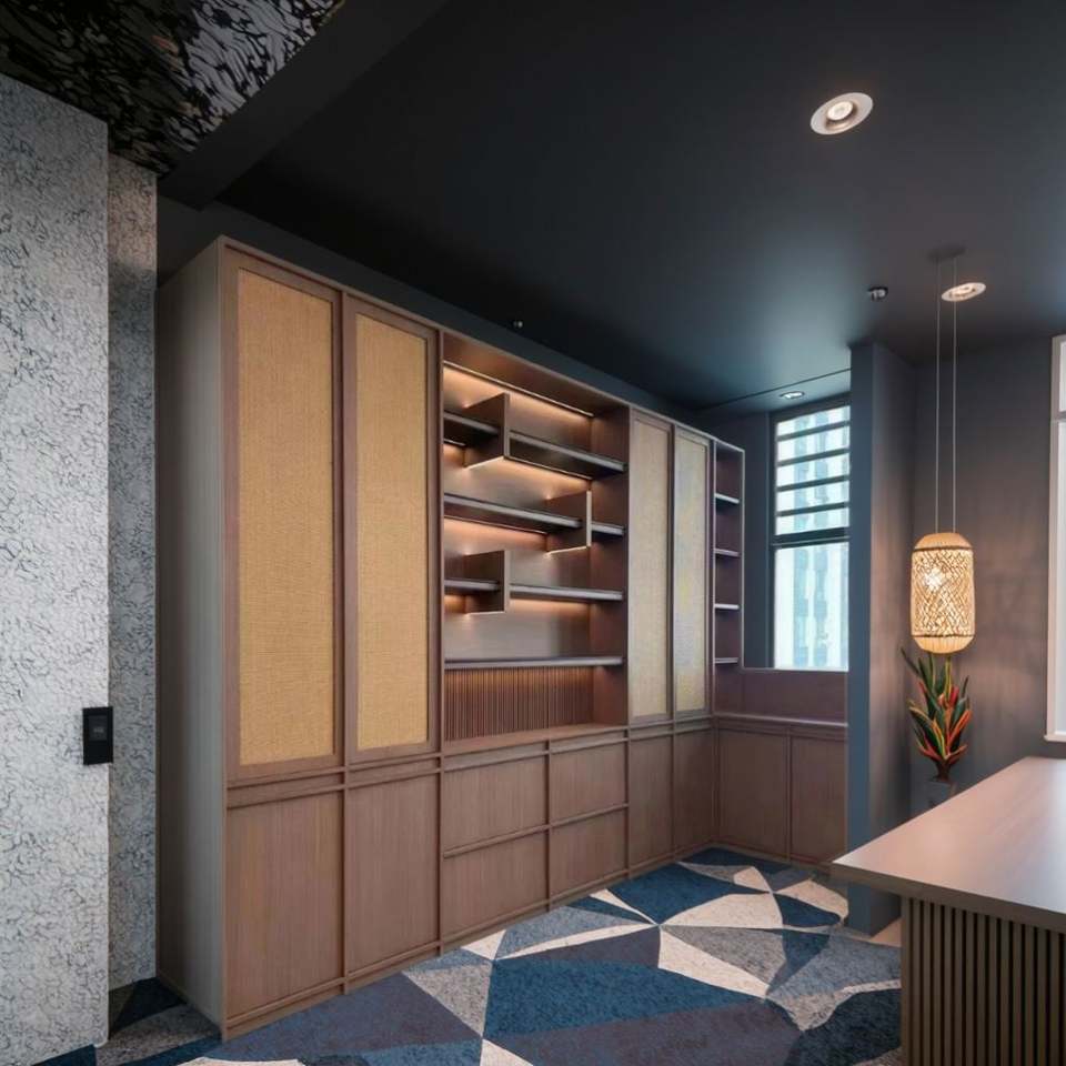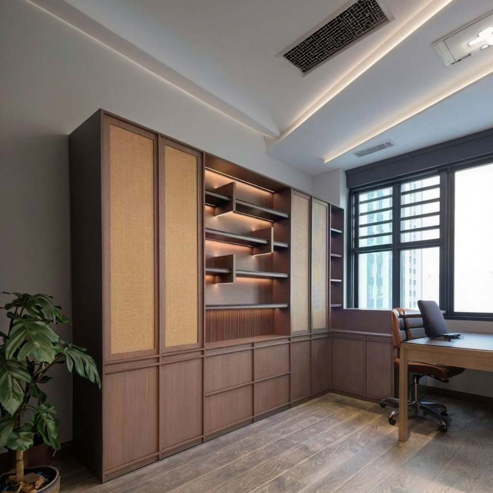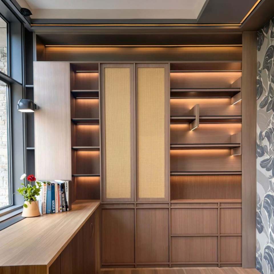 ตู้หนังสือไม้พร้อมโต๊ะทำงานสำหรับบ้าน