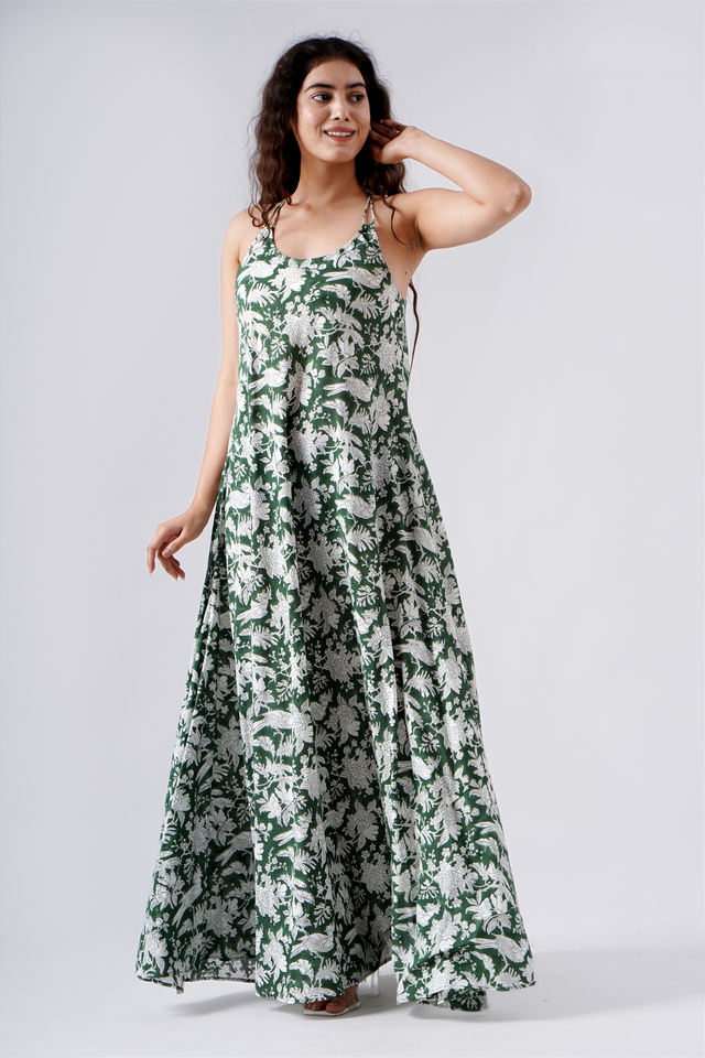 Indian Hand Block Printed 100% Cotton Rifle Green Dress for Women Summers Wedding Dress Comfort Wear Maxi Dress Daily Wear