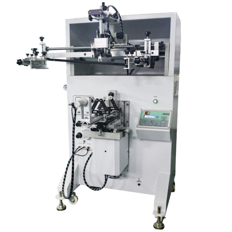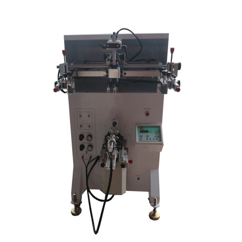 เครื่องพิมพ์สกรีนแบบกึ่งอัตโนมัติควบคุมด้วยไมโครคอมพิวเตอร์รุ่นใหม่สำหรับพิมพ์ฉลากบนทรงกระบอก แก้ว ขวด และโหล