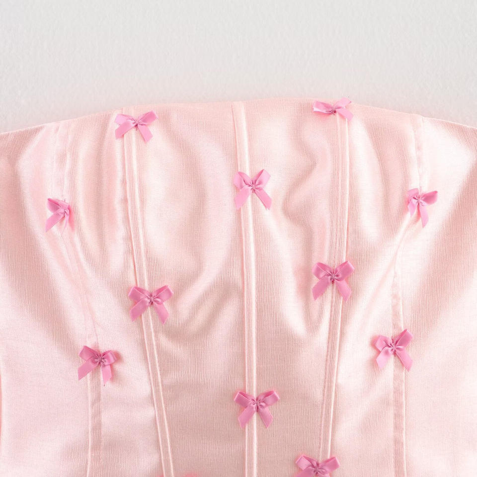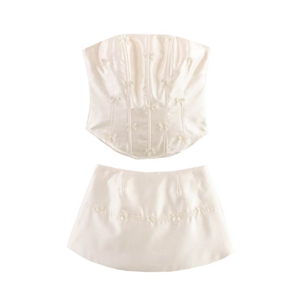 ชุดเซ็ต 2 ชิ้น เสื้อเปิดหลังผูกโบว์ลายก้างปลา กระโปรงสั้น แฟชั่นสำหรับผู้หญิง สไตล์เซ็กซี่