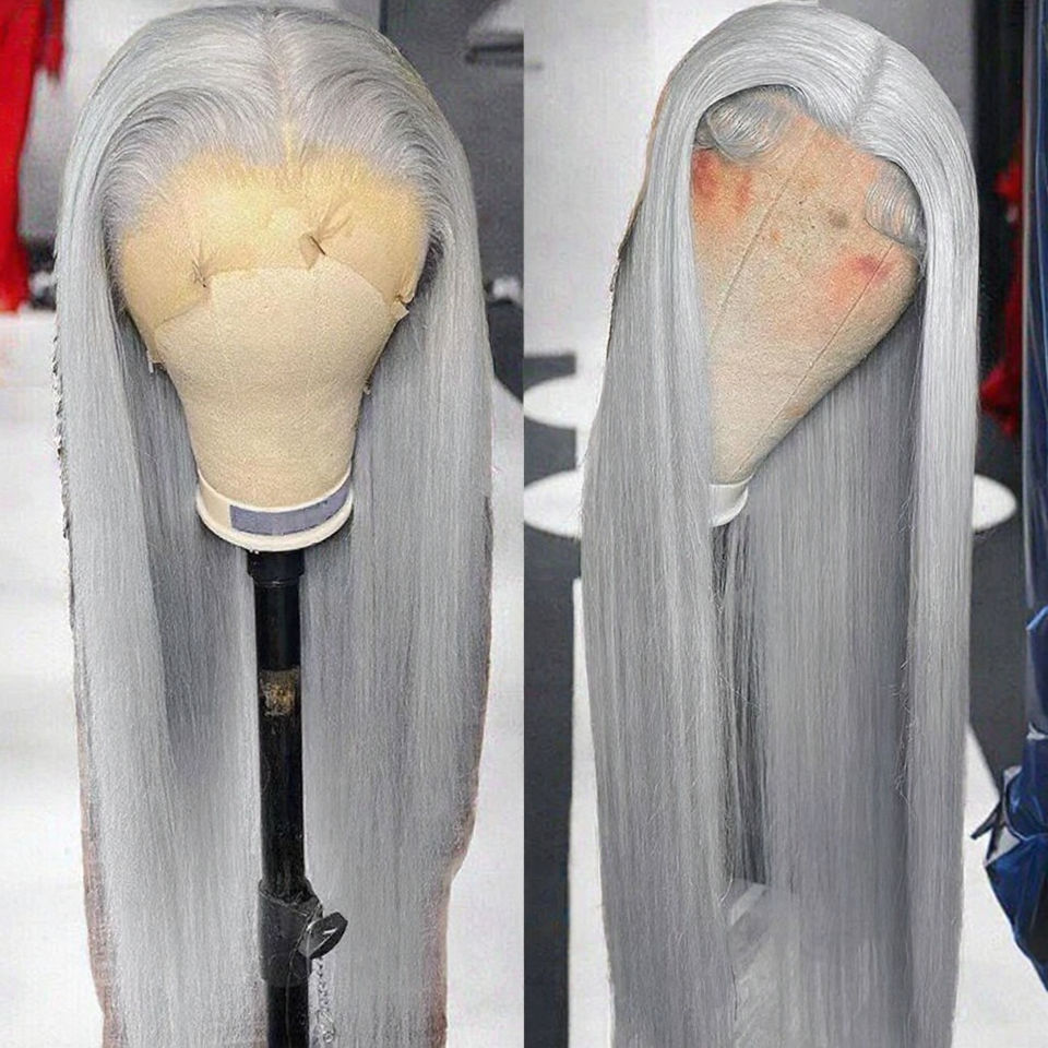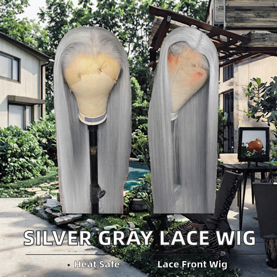 วิกผมยาวตรงยาวสีเทาเงินใหม่ผ้าคลุมศีรษะทำจากเส้นใยทางเคมีด้านหน้าสำหรับยุโรปและสหรัฐอเมริกาวิกทั้งหมด