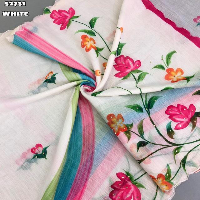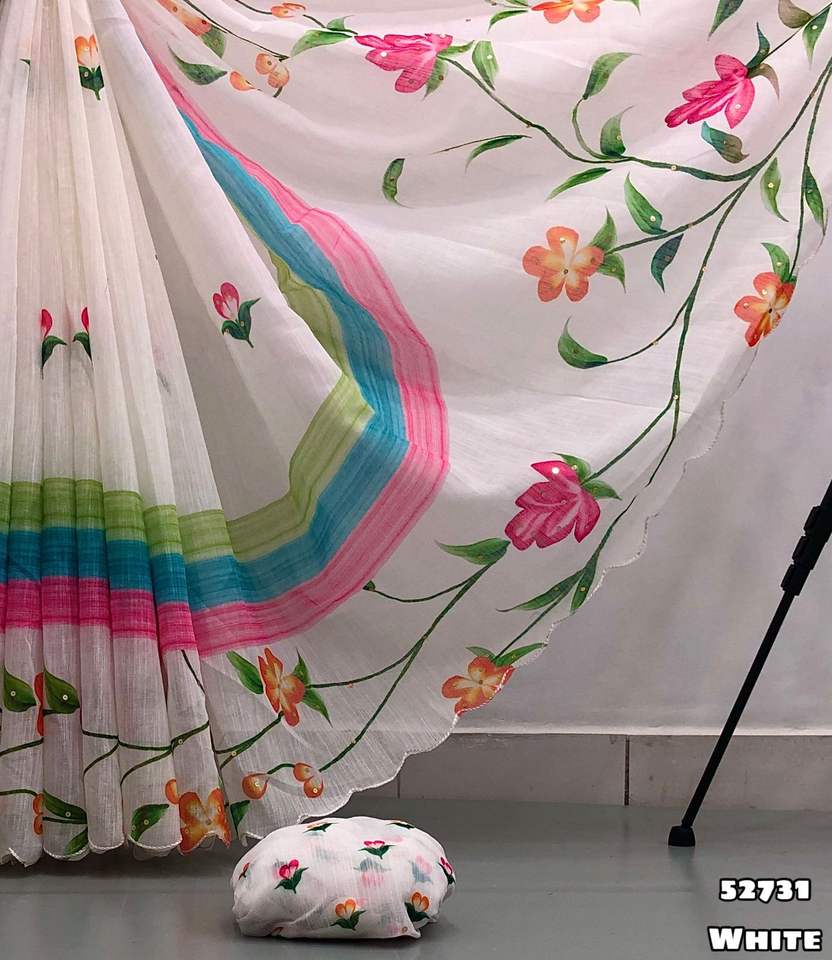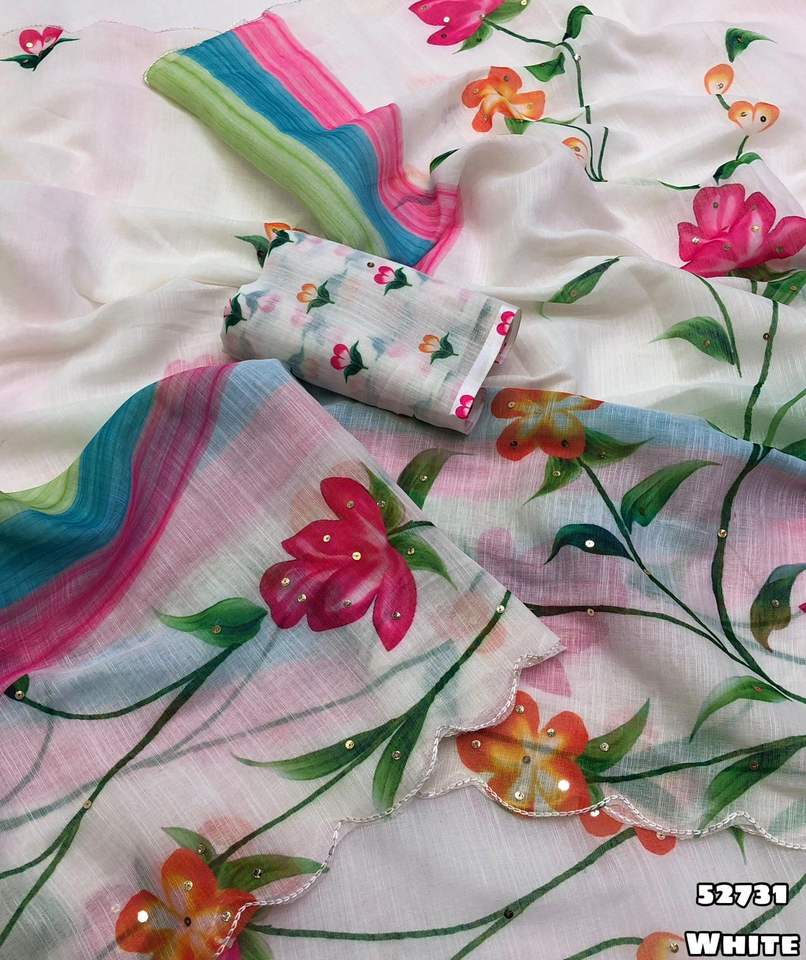New Soft Linen Brush Print Style Saree with Sequence Work Embroidery and Scalloped Cutwork Border for Women Adults