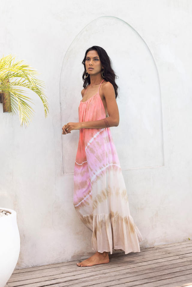 ชุดเดรสชายหาดสไตล์โบฮีเมียนโบฮีเมียนพร้อมสายรัดสปาเก็ตตี้เปลือยหลังมัดย้อมสไตล์โบฮีเมียนใหม่ฤดูร้อน
