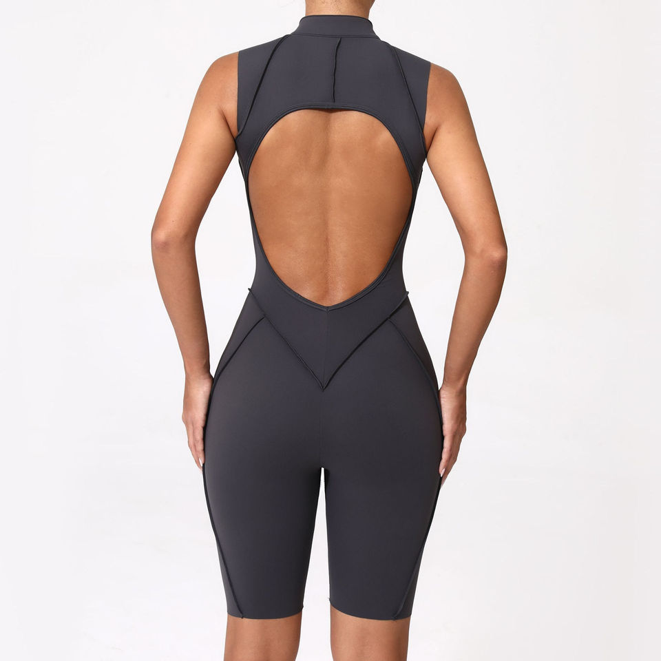 ชุดบอดี้สูทและจัมพ์สูทโยคะใหม่พร้อมแปรงวัสดุเปิดหลังมีซิปสำหรับวิ่งและฟิตเนส