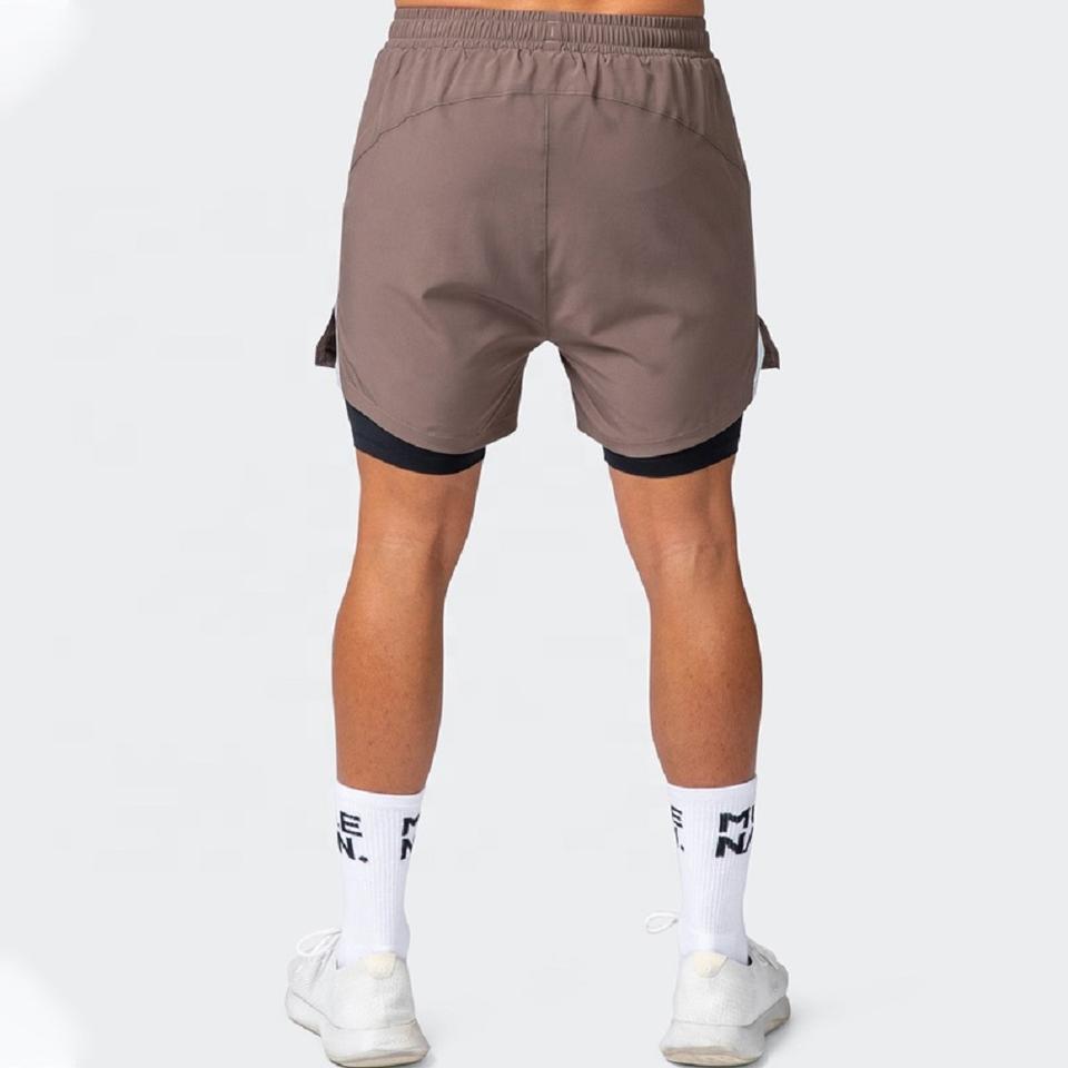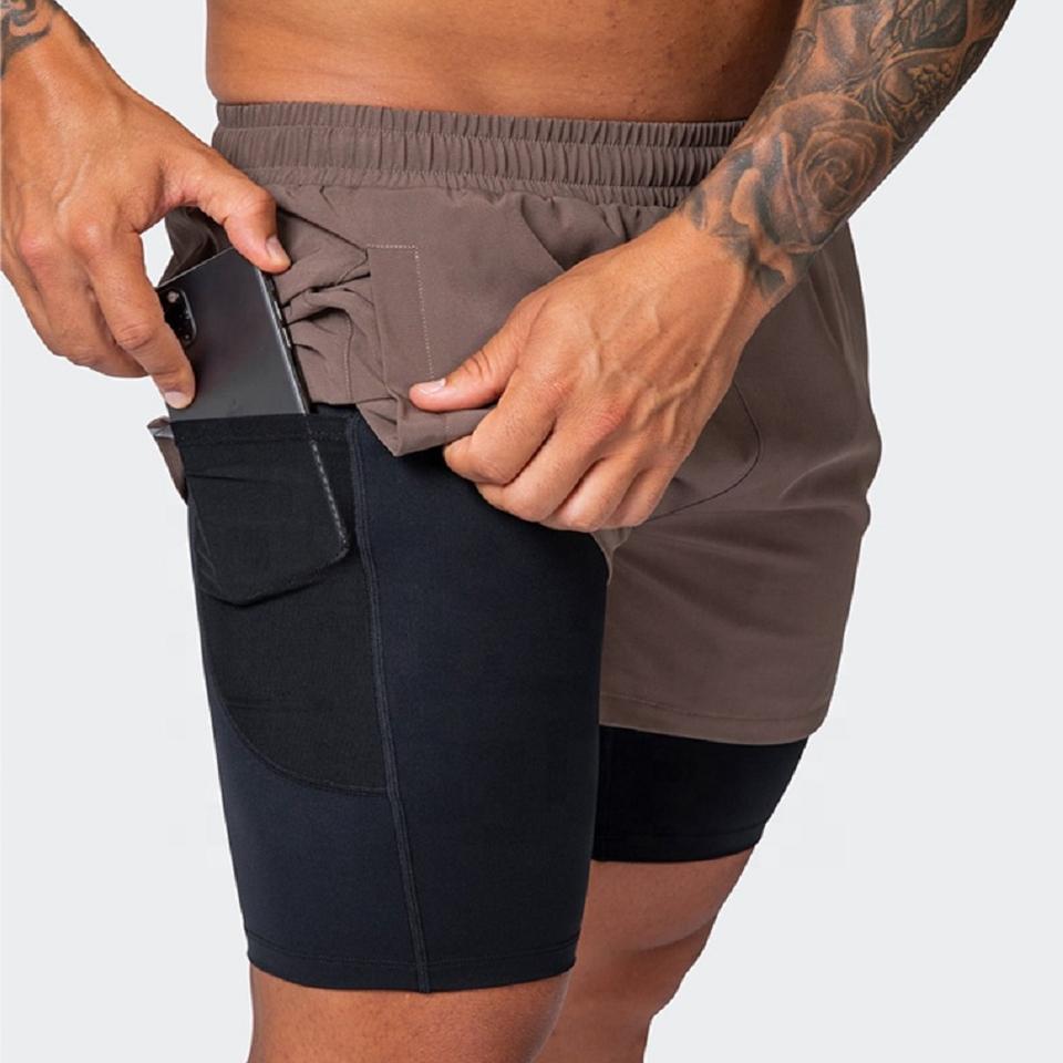 กางเกงขาสั้นเล่นกีฬาแบบ2 in 1ผ้าโพลีเอสเตอร์สแปนเด็กซ์แห้งเร็วพร้อมกระเป๋าสำหรับผู้ชายใหม่