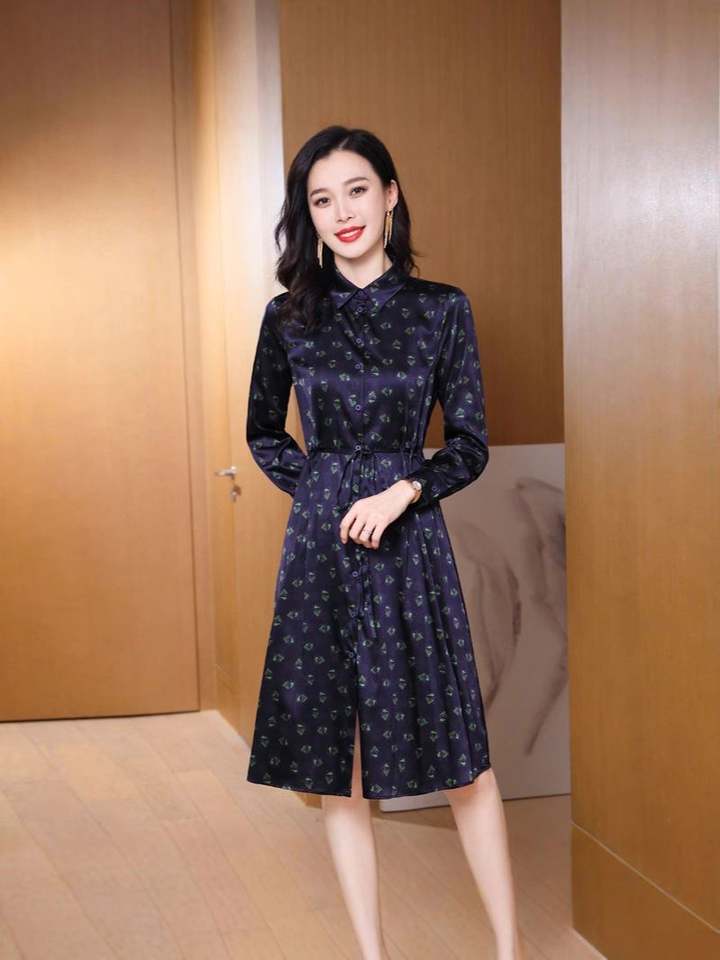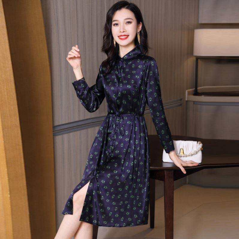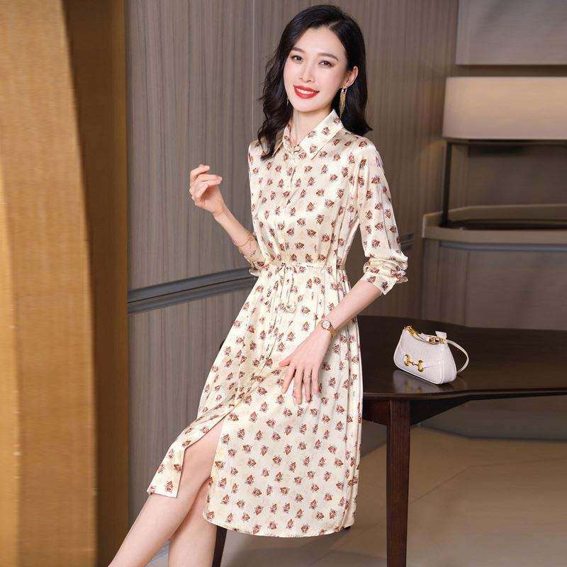 ชุดเดรสแขนยาวสำหรับผู้หญิง, ชุดเดรสผ้าไหมพิมพ์ลายทรงเอยาวปานกลางลำลองใหม่ฤดูใบไม้ผลิและฤดูร้อน