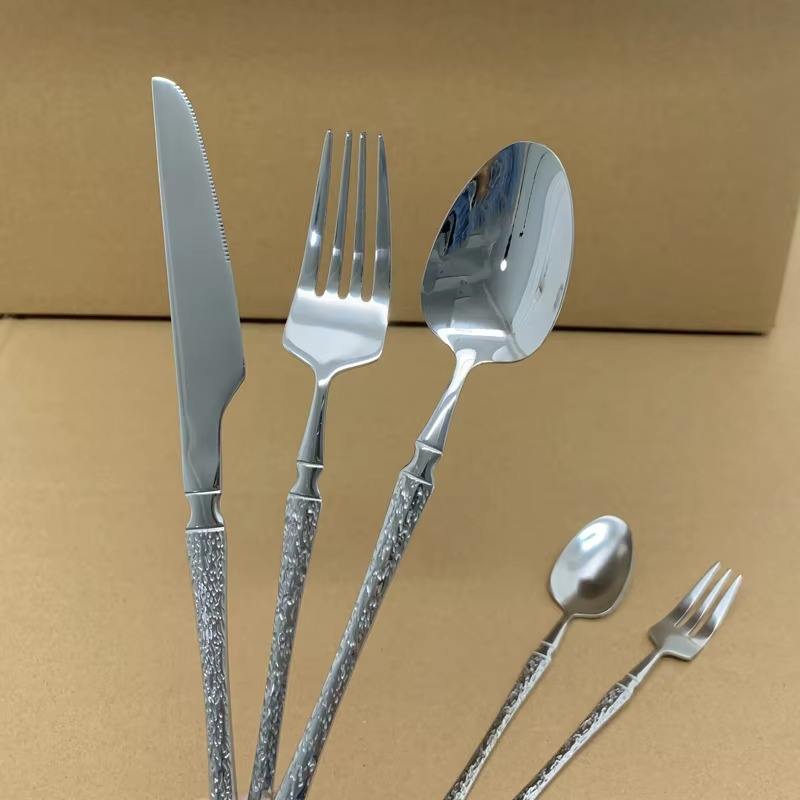 ชุดเครื่องใช้บนโต๊ะอาหารสแตนเลสใหม่ช้อนส้อมมีดสีเงินเป็นมิตรกับสิ่งแวดล้อมสำหรับบ้านหรืองานแต่งงานคอลเลกชันใหม่