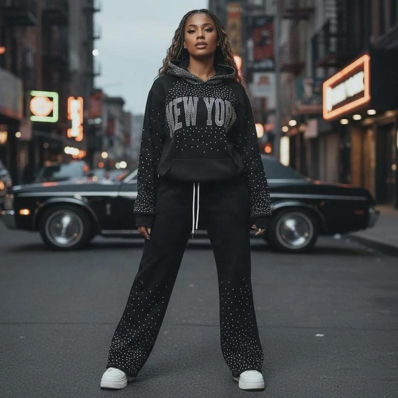 ชุดเซ็ตฮู้ดดี้ลายดาวประดับเพชรเทียม กางเกงวอร์มทรงบэгกี้ขาบาน ผ้าคอตตอนพรีเมียมเนื้อหนา สไตล์โอเวอร์ไซส์ ยูนิเซ็กส์