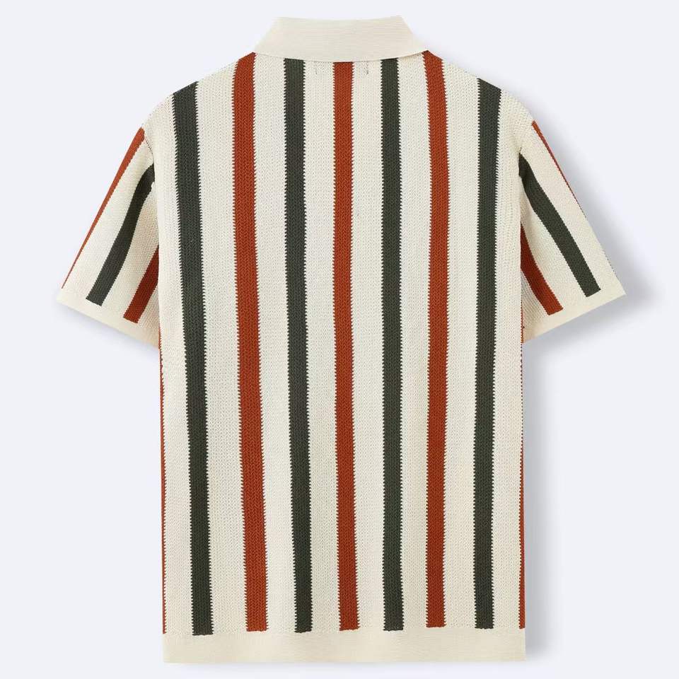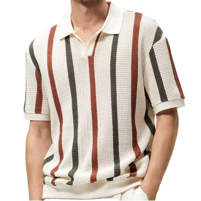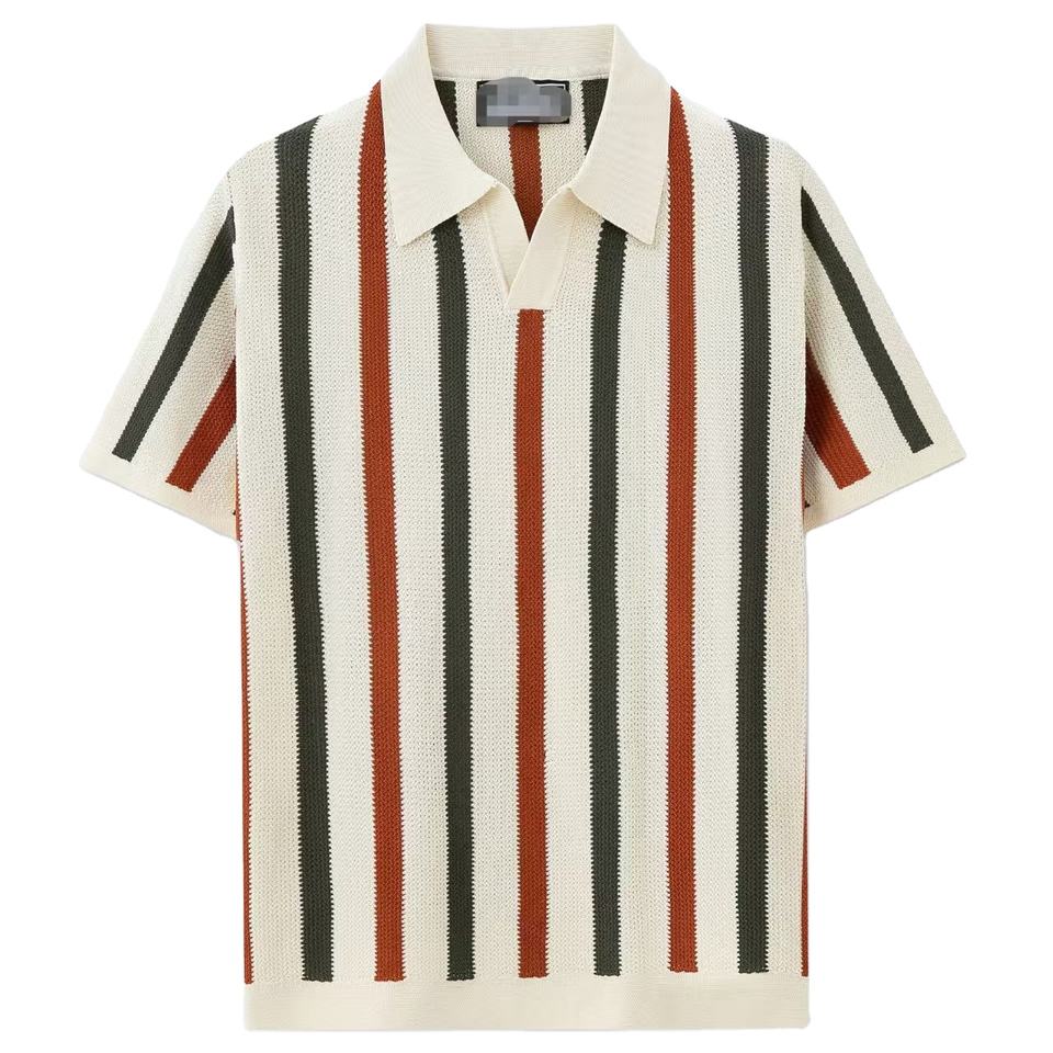 เสื้อผ้าแคชเมียร์แบบเปิดลงลายทางสำหรับผู้ชายเสื้อโปโลถักแขนสั้นระบายอากาศได้ดีสำหรับฤดูร้อนสต็อกใหม่