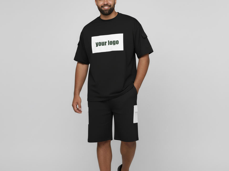 ชุดเซ็ตเสื้อยืดและกางเกงขาสั้นผู้ชายไซส์ใหญ่ ผ้าฝ้าย 100% สไตล์ใหม่ ปรับแต่งได้ พร้อมปักโลโก้หรือสกรีนลายตามสั่ง