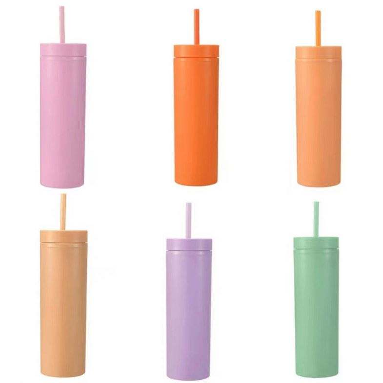 กระบอกน้ำพลาสติก16ออนซ์ขวดน้ำอะคริลิกไร้สาร BPA พร้อมฝาและหลอดแก้วทรงผอมผนังสองชั้น