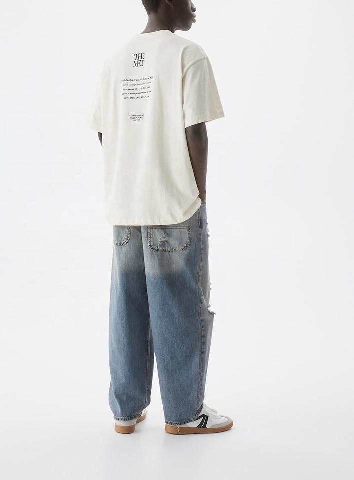 เสื้อยืดผู้ชายทรงหลวมพิมพ์ลายถักนิตติ้งคุณภาพสูงแบบใหม่ปี 2025 ผลิตตามสั่ง (OEM) ผ้าฝ้าย 100% ไหล่ตกทั้งสองข้าง