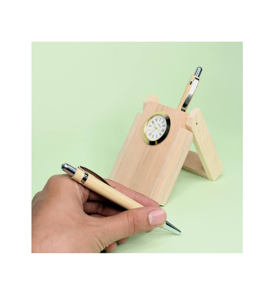 ที่ใส่แปรงแต่งหน้าทำจากไม้อะคาเซียที่ใส่ปากกาด้ามไม้พร้อมนาฬิกาอุปกรณ์สำนักงานที่วางปากกาทำจากไม้