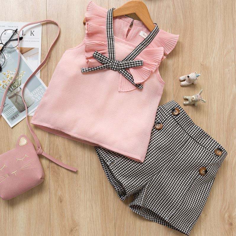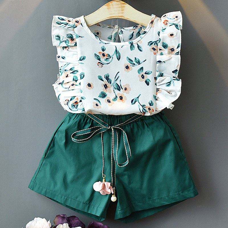 ชุดเสื้อผ้าเด็กผู้หญิงลำลองลายดอกไม้สำหรับฤดูร้อน แบรนด์ใหม่ เสื้อยืดแขนสั้นผ้าใยไผ่ 100% กางเกงขายาว ชุดเดรส 2 ชิ้น เสื้อผ้าเด็ก
