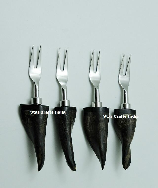 ชุดชีสสไตล์ใหม่สำหรับขาย คุณภาพดีเยี่ยม ชุดช้อนส้อมขัดเงาด้วยมือ พร้อมด้ามจับทำจากเขาสัตว์สีดำ สำหรับใช้ในโรงแรม บ้าน และร้านอาหาร