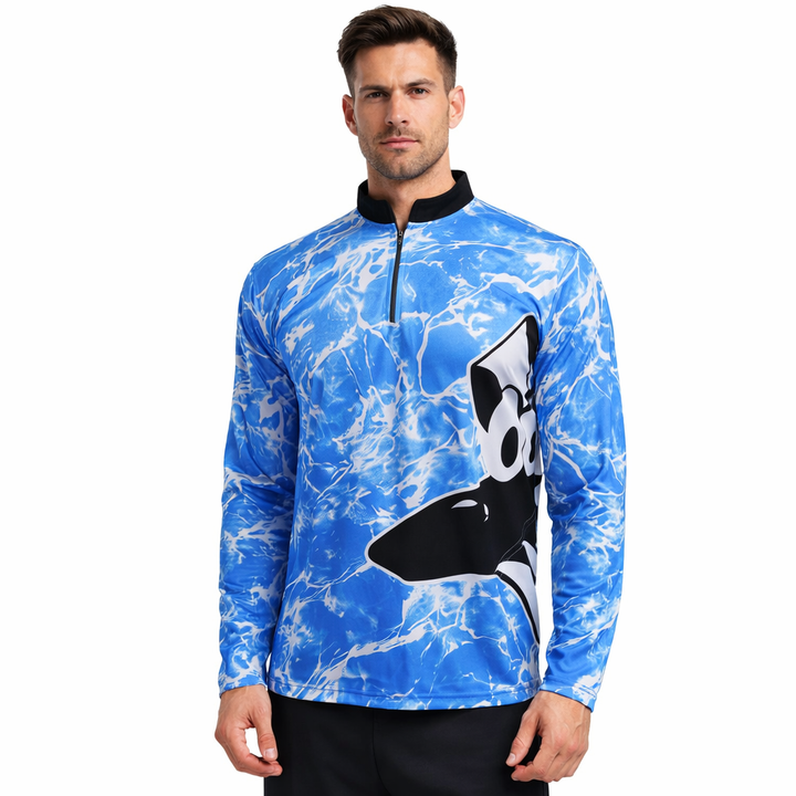 เสื้อตกปลาผู้ชาย แขนยาว คอซิป 1/4 ผ้าเจอร์ซีย์ประสิทธิภาพสูง ป้องกันรังสียูวี 50 โพลีเอสเตอร์ 100% แห้งเร็ว ระบายอากาศได้ดี ชุดกีฬา