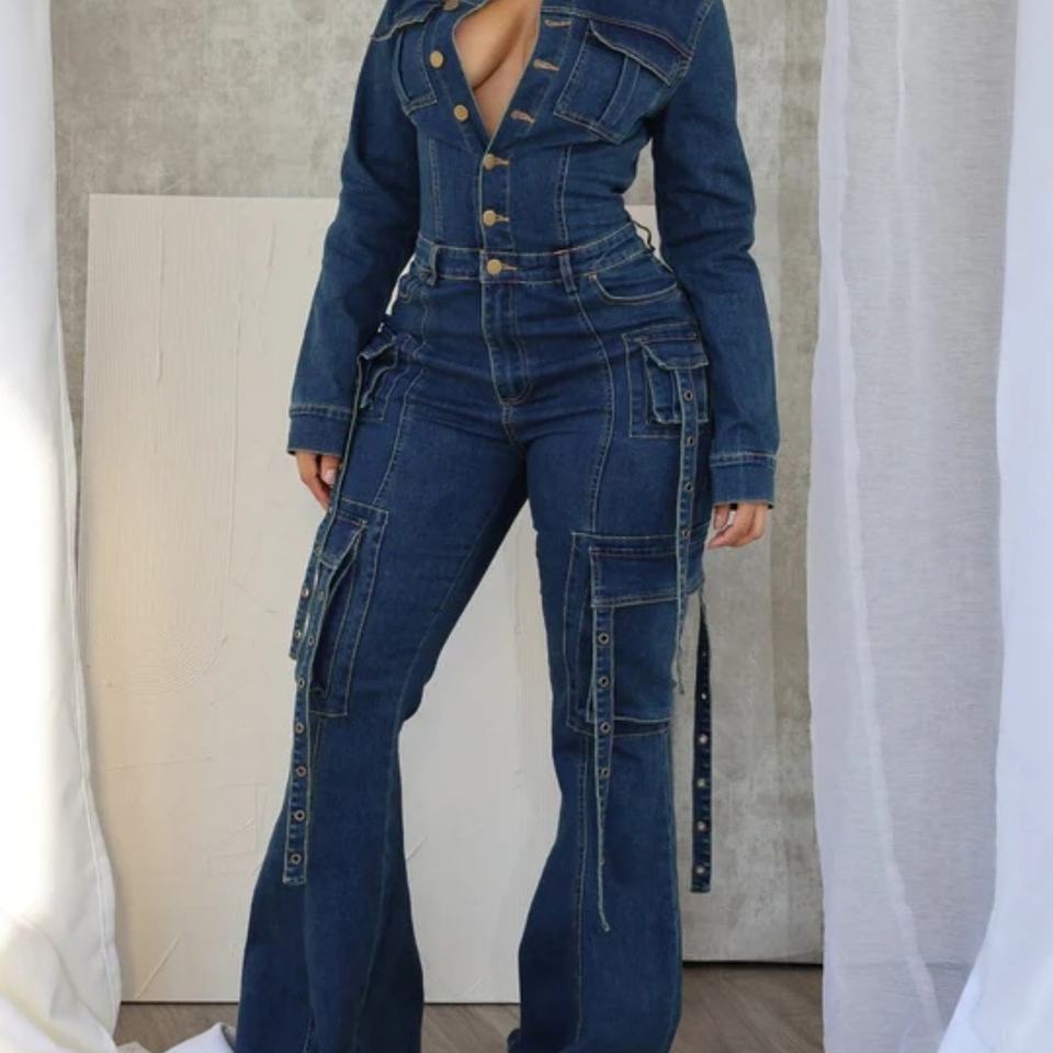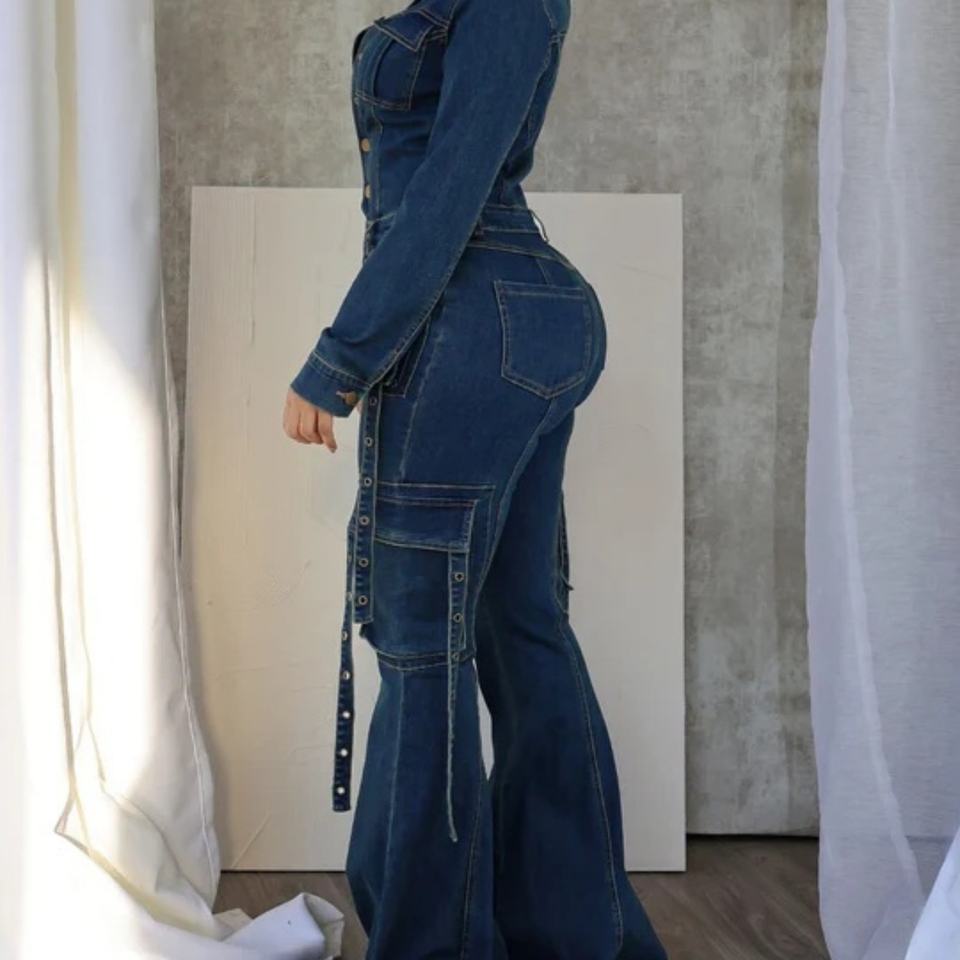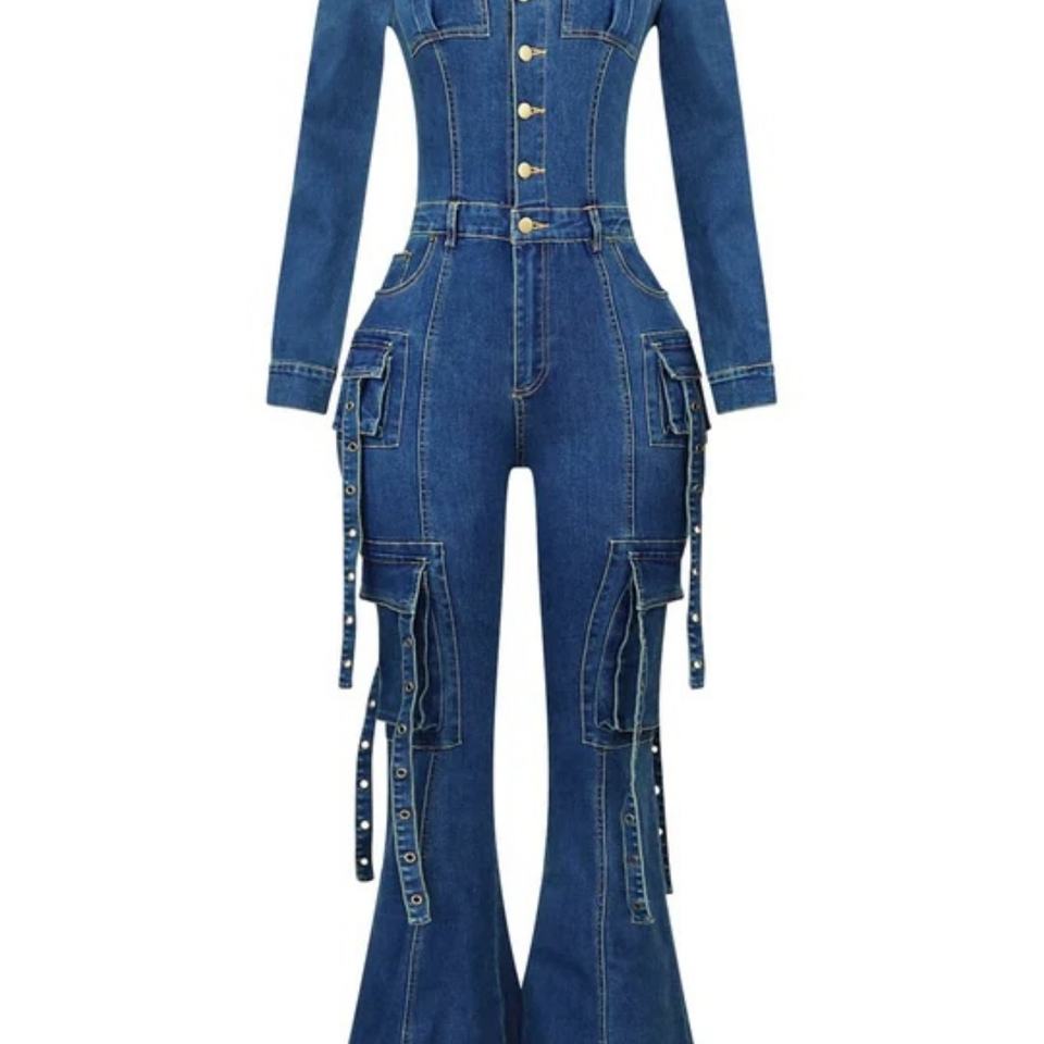 จั๊มสูทเดนิมทรงขาบานแบบใหม่สำหรับผู้หญิง คอปกพับติดกระดุม แขนยาว
