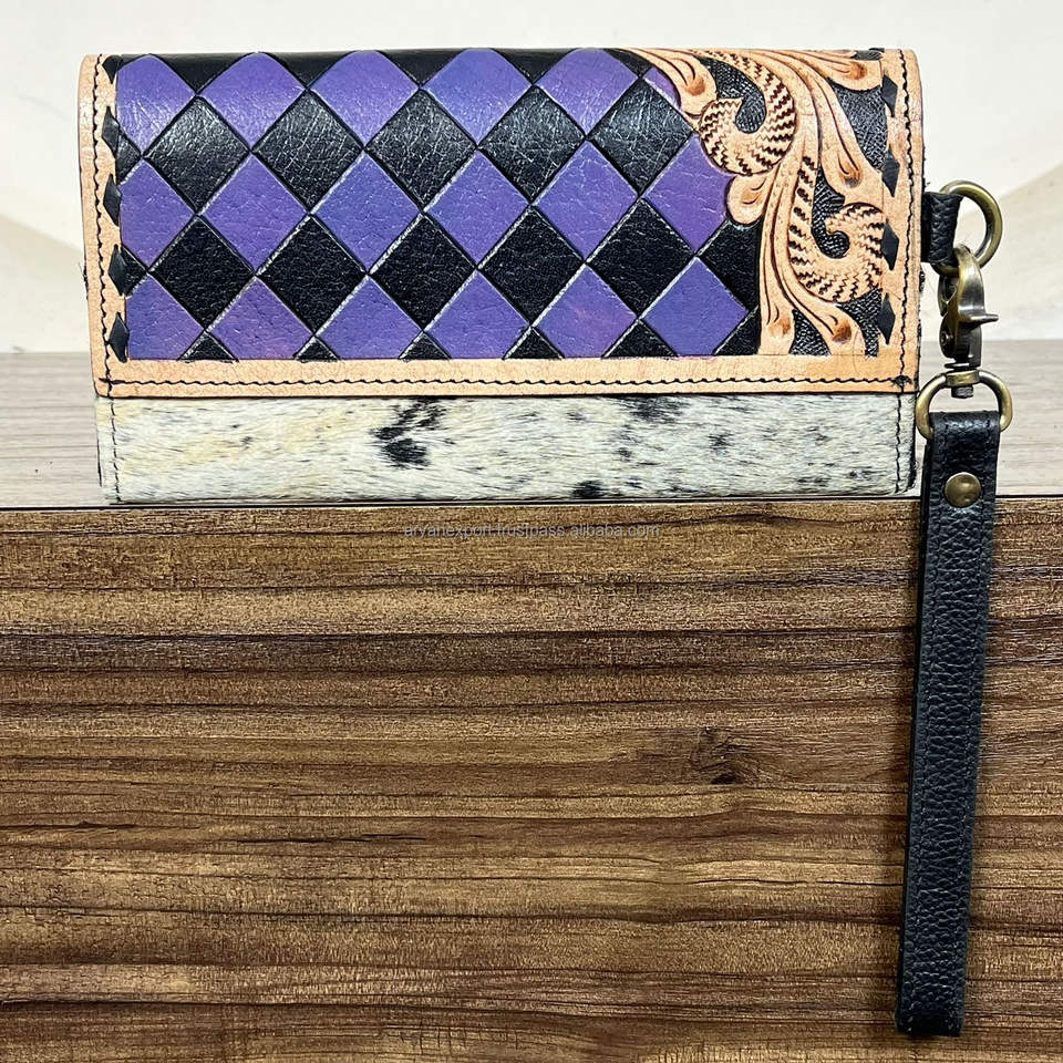 กระเป๋าสตางค์คล้องมือหนังลายตารางหมากรุกทำมือ