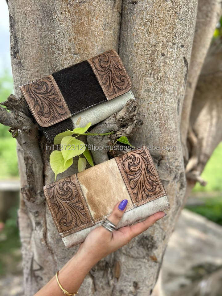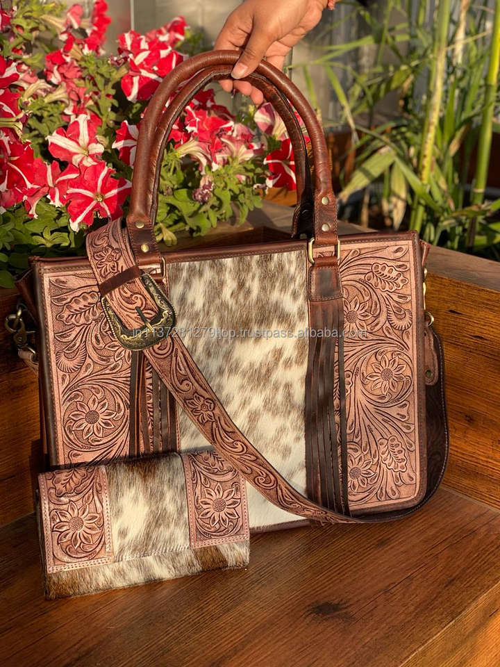 สไตล์ใหม่จริงทําด้วยมือTooledดอกไม้พิมพ์Cowhideขนสัตว์หนังToteกระเป๋าใหม่Western Toolledขนสัตว์หนังคลัทช์Comboชุด