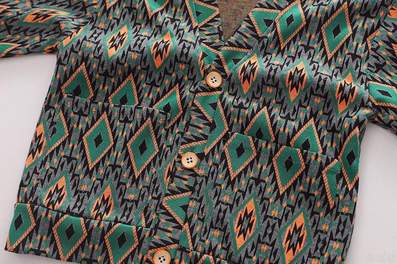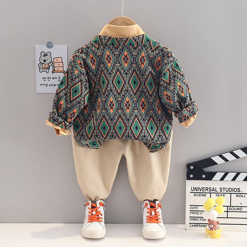 ชุดเสื้อผ้าเด็กผู้ชาย 3 ชิ้น สไตล์ใหม่ สำหรับฤดูใบไม้ผลิและฤดูใบไม้ร่วง เสื้อคลุมคาร์ดิแกนแขนยาวพิมพ์ลาย + เสื้อเชิ้ตสีพื้น + กางเกงลำลอง