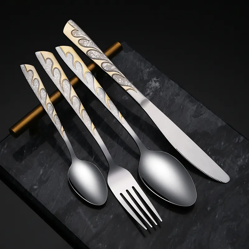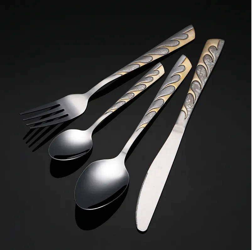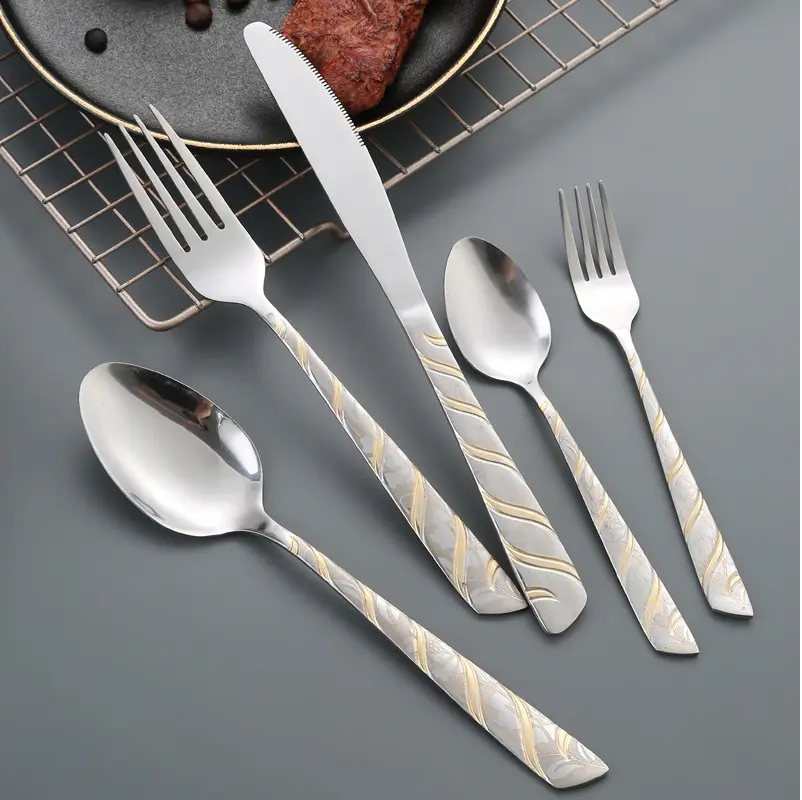 ชุดเครื่องใช้บนโต๊ะอาหารสแตนเลสแบบตะวันตกชุบทองสุดสร้างสรรค์ช้อนโรงแรมส้อมมีดชุดเครื่องใช้บนโต๊ะอาหารสไตล์ใหม่ทำจากเหล็กกระจก