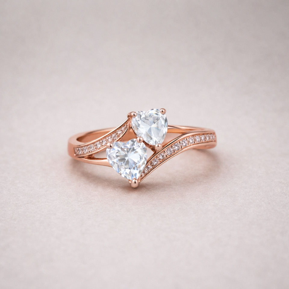 แหวนเงินแท้ทรงใหม่ประดับเพชรแล็บ ทองคำขาว 14K ดีไซน์หัวใจคู่ แหวนสัญญาประดับเพชรแล็บแบบ Bypass Shank ของขวัญวันวาเลนไทน์
