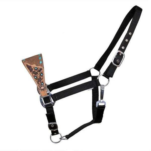 สายจูงม้าหนังแท้ลายดอกทานตะวันแบบใหม่ พร้อมสายรัดจมูกหนังแท้แบบถักด้วยมือ ขอบสายรัดจมูกทำจากหนังดิบ