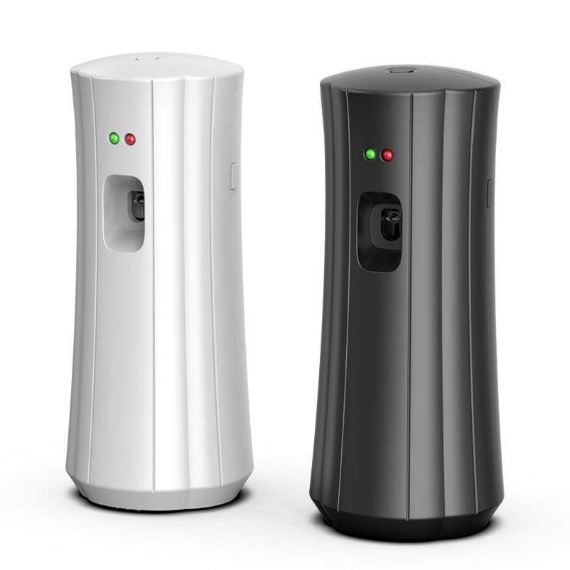 เครื่องพ่นละอองน้ำหอมอัตโนมัติสำหรับห้องน้ำอุปกรณ์ดับกลิ่นในห้องแบตเตอรี่ AA เครื่องพ่นละอองน้ำหอมอัตโนมัติสีดำสำหรับห้องน้ำ