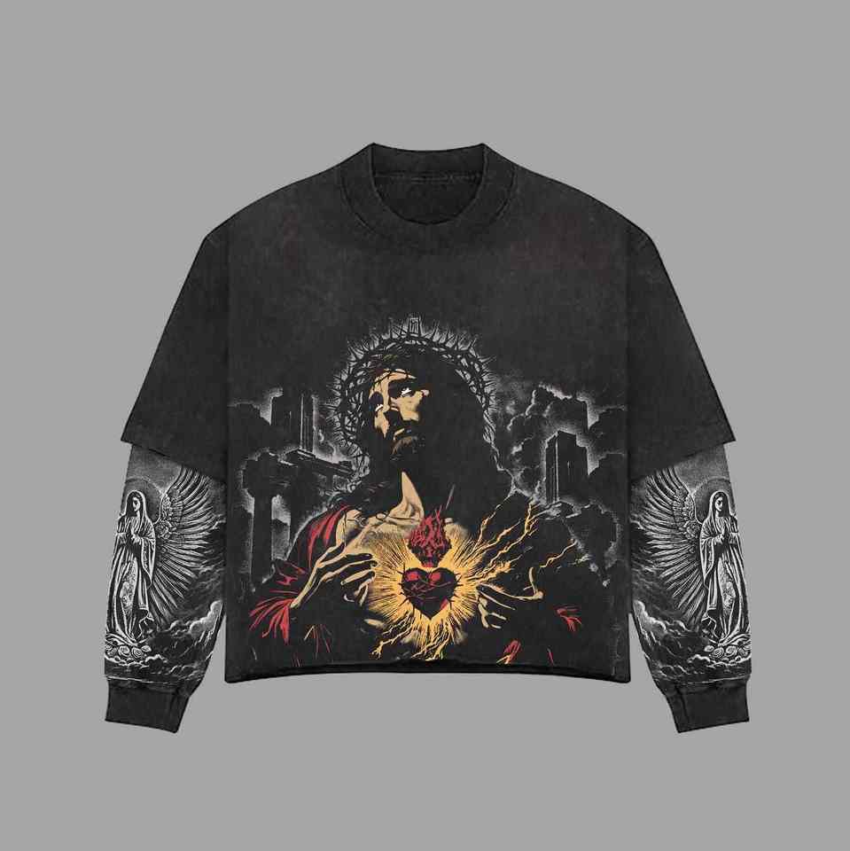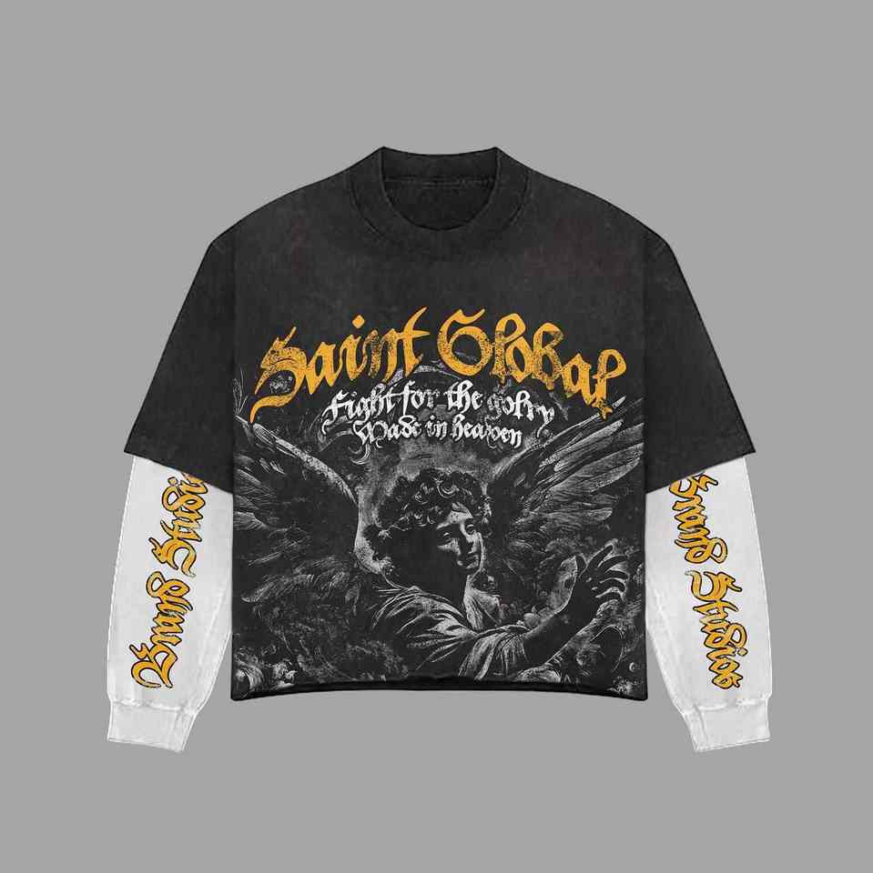 เสื้อยืดไหล่ผ้าฝ้าย100% สองชั้นวาฟเฟิลถักแขนยาวสำหรับผู้ชายสไตล์ใหม่