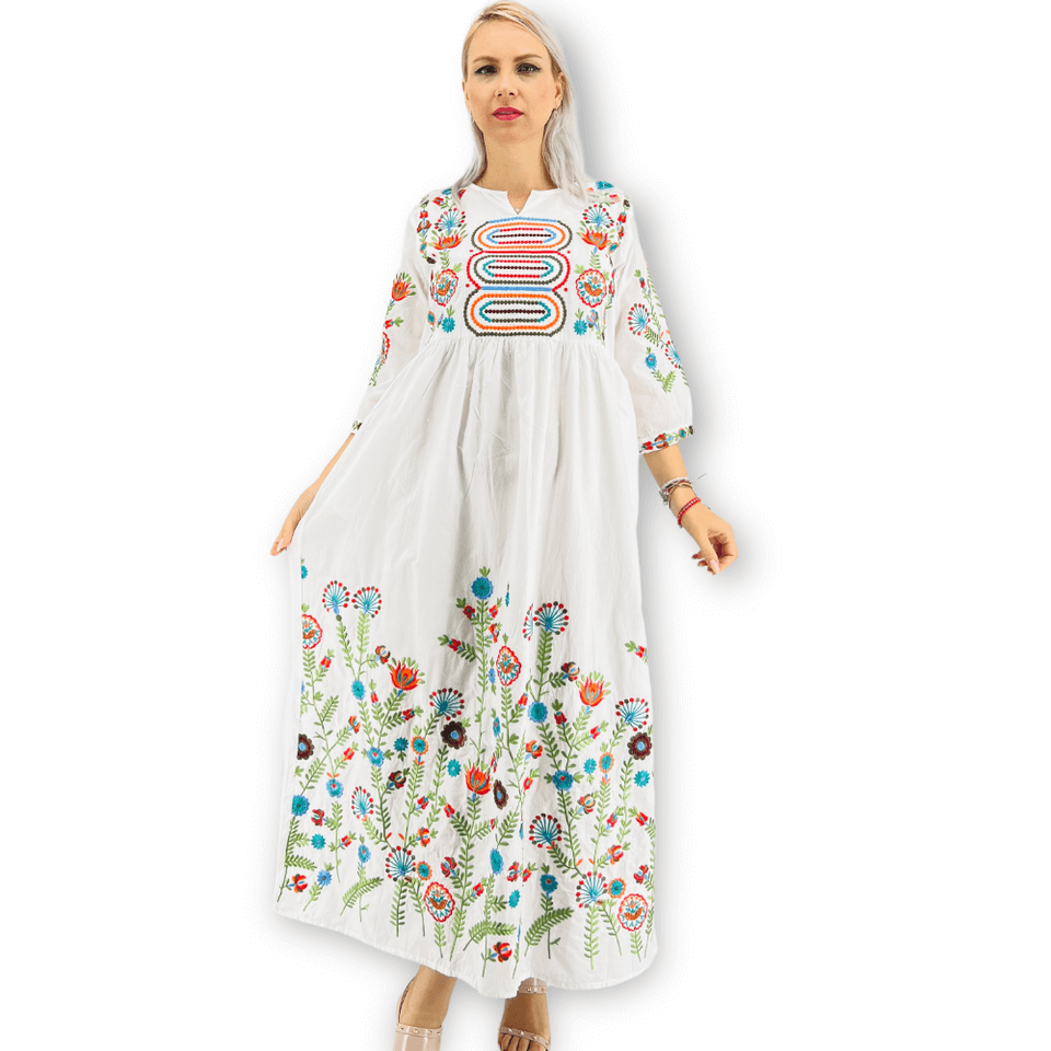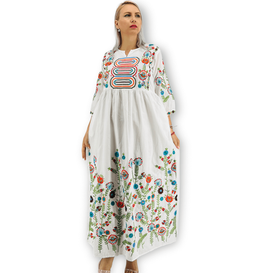 เดรสปักลายดอกไม้แขน3/4ยาวถึงข้อเท้าสำหรับผู้หญิงสไตล์ใหม่