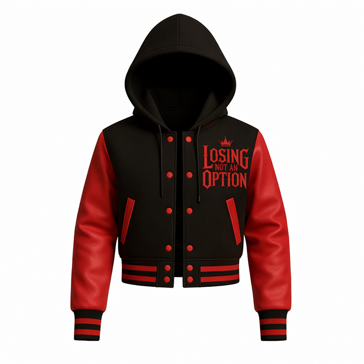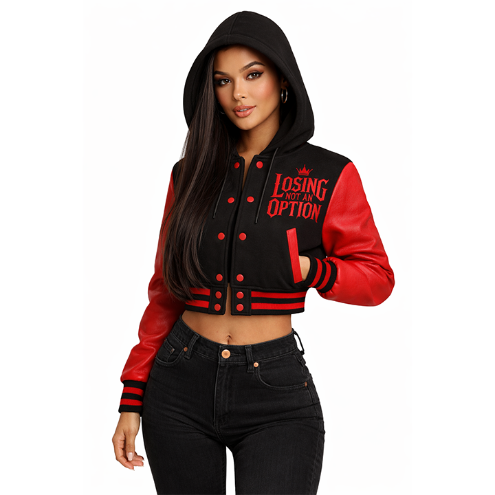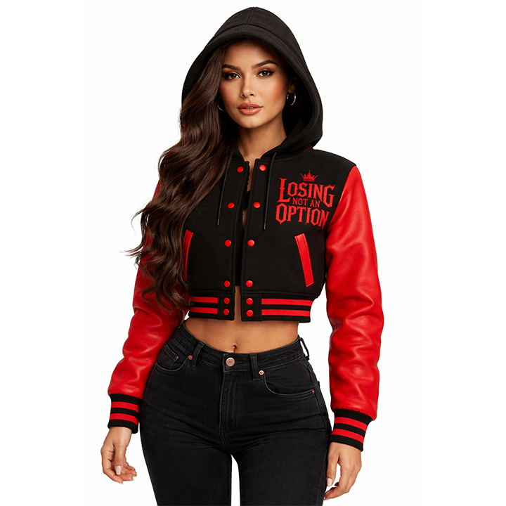 แจ็กเก็ตสไตล์ใหม่สำหรับผู้หญิง "แพ้ไม่ใช่ตัวเลือก" ตัวครอปตัวแทนมหาวิทยาลัย-เครื่องบินทิ้งระเบิดมีฮู้ดสีแดง & สีดำสำหรับสตรีทแวร์ & แรงจูงใจ