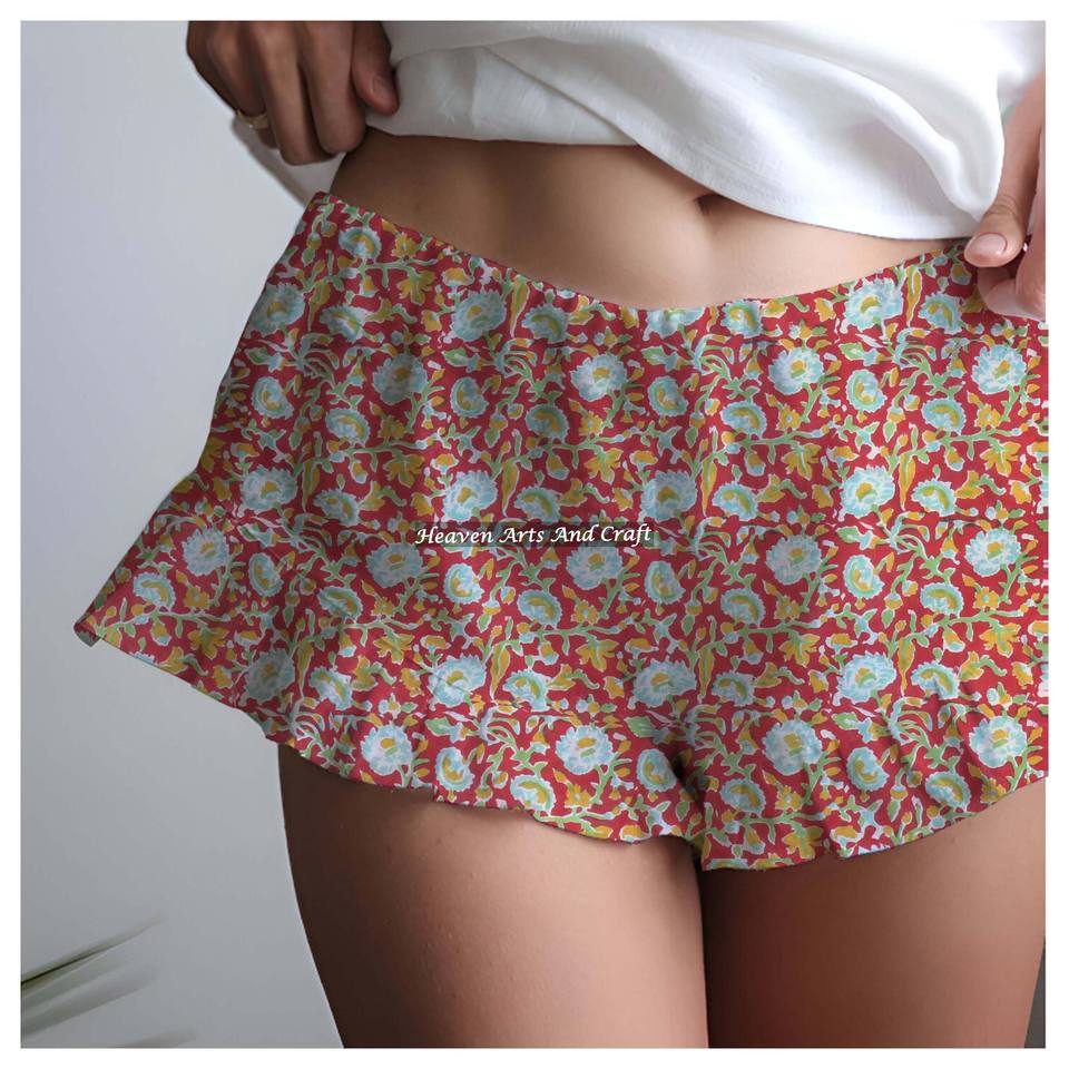 ชื่อสินค้า:กางเกงขาสั้นผ้าฝ้าย 100% พิมพ์ลายบล็อกมือ แต่งระบาย