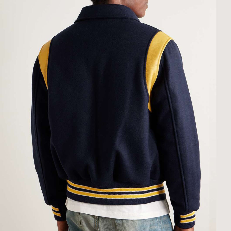 แจ็คเก็ตเบสบอลผู้ชายแบบใหม่ทันสมัย ปักโลโก้ด้วยไหมเชนิลล์ แขนหนัง แจ็คเก็ตเลตเตอร์แมนสำหรับฤดูหนาว