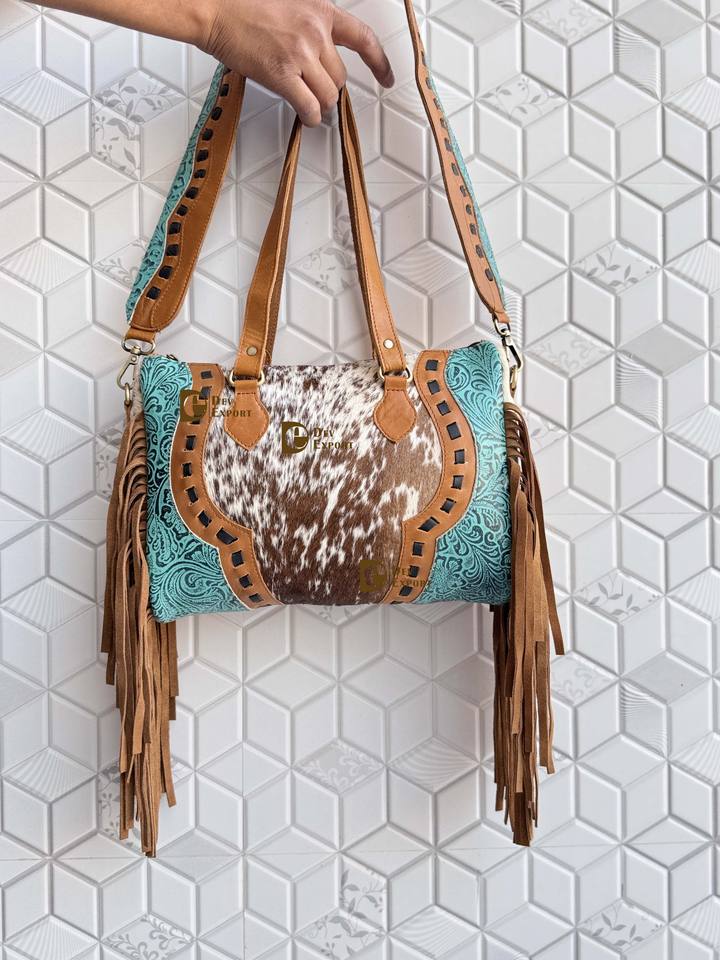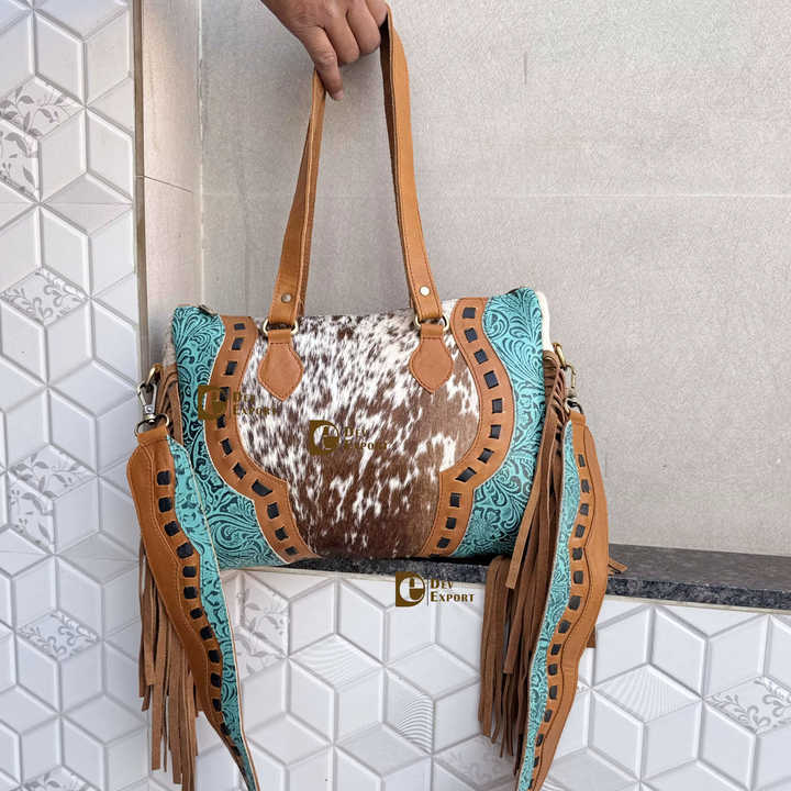 New Stylish Pattern Western Cowhide Leather Hand Tooled Carving Leather Fringe Tote Bag Stylish Purse Leather Bags for Women's